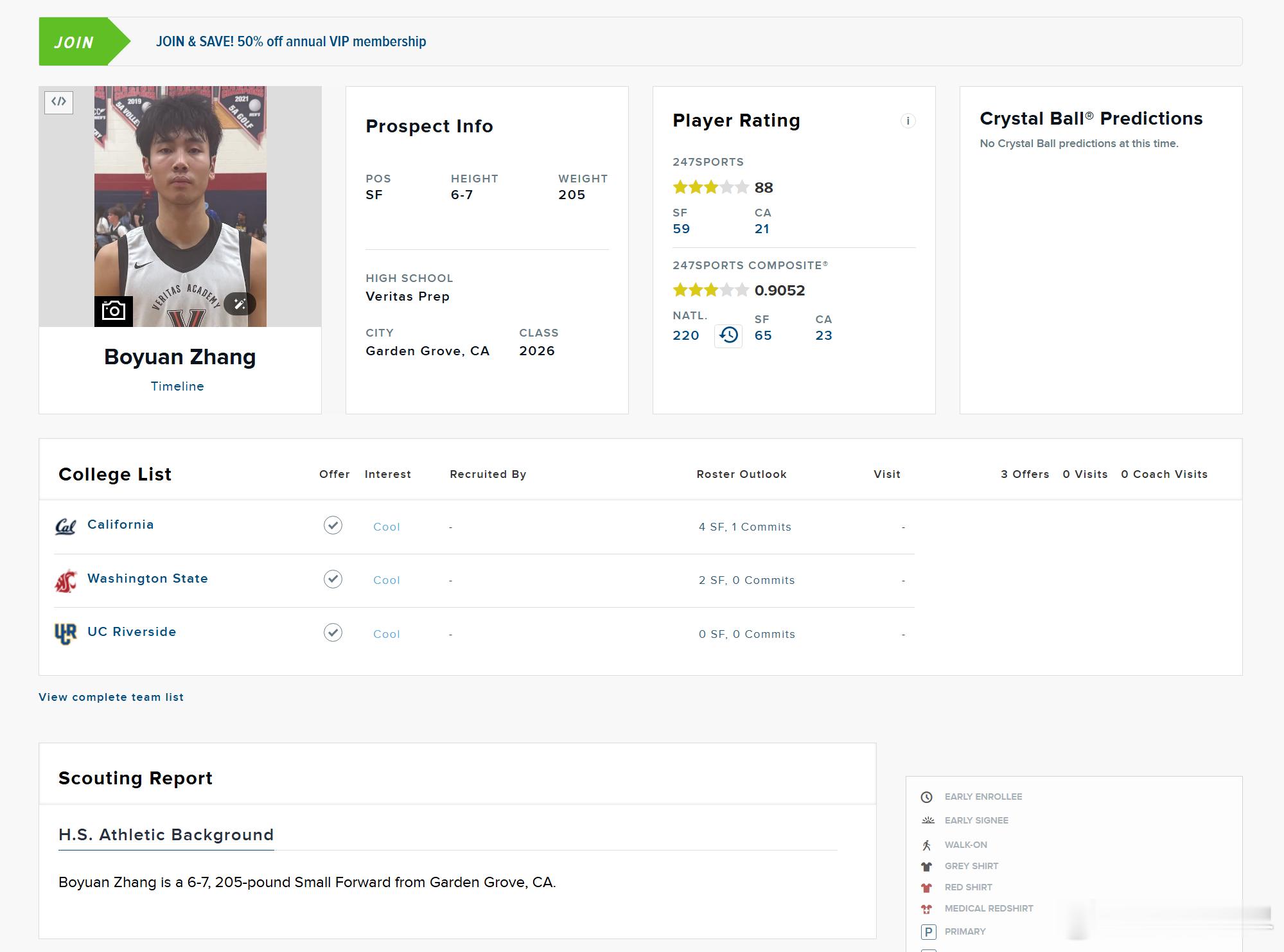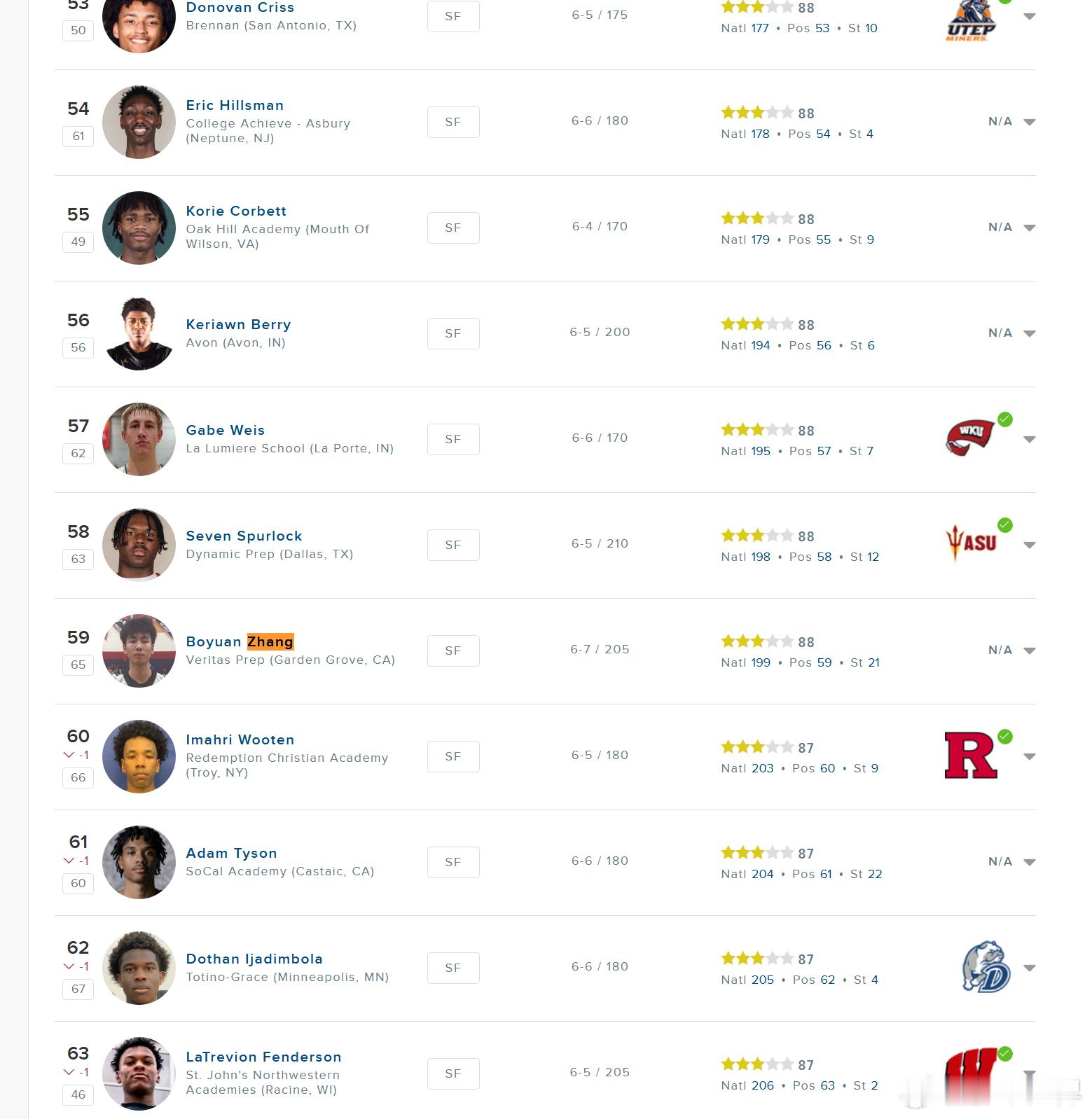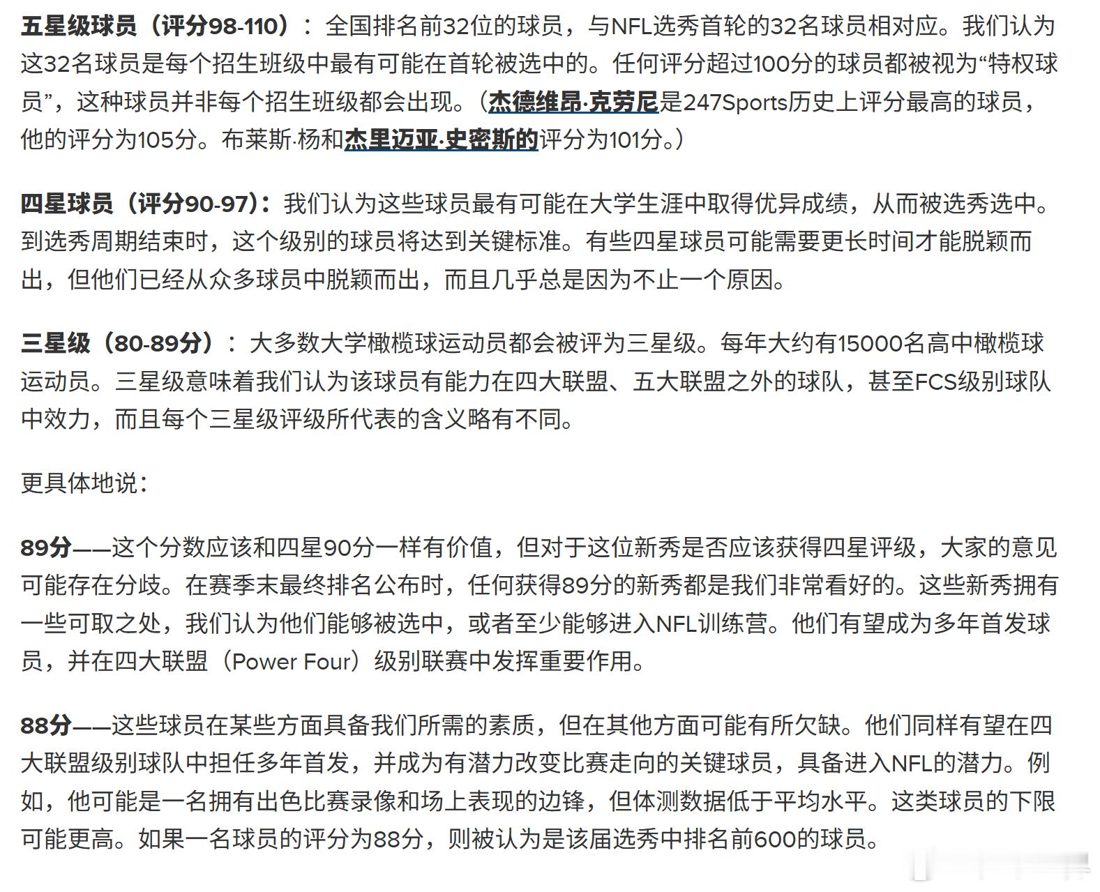 张博源第一次评上星级了,247评级是88分三星,全美排名第59小前锋(2026 Top Small Forward Recruits)!干就完了,继续猛猛刷战绩,刷offer吧!张博源美高3星高中生 图三,247官网给88分球员的定义(用橄榄球举例):88分——这些球员在某些方面具备我们所需的素质,但在其他方面可能有所欠缺。他们同样有望在四大联盟级别球队中担任多年首发,并成为有潜力改变比赛走向的关键球员,具备进入NFL的潜力。例如,他可能是一名拥有出色比赛录像和场上表现的边锋,但体测数据低于平均水平。这类球员的下限可能更高。如果一名球员的评分为88分,则被认为是该届选秀中排名前600的球员(NFL每年约选中250人)。