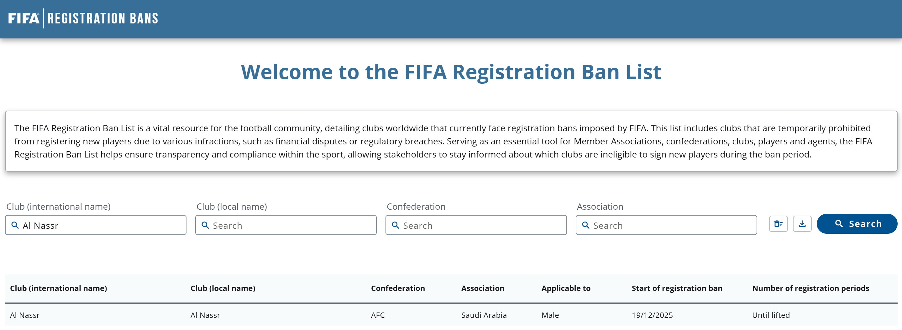虎扑12月19日讯根据FIFA官网公布的注册禁令名单显示,沙特球队利雅得胜利自12月19日起被禁止注册新球员,相关处罚即刻生效,且未注明具体解除时间。