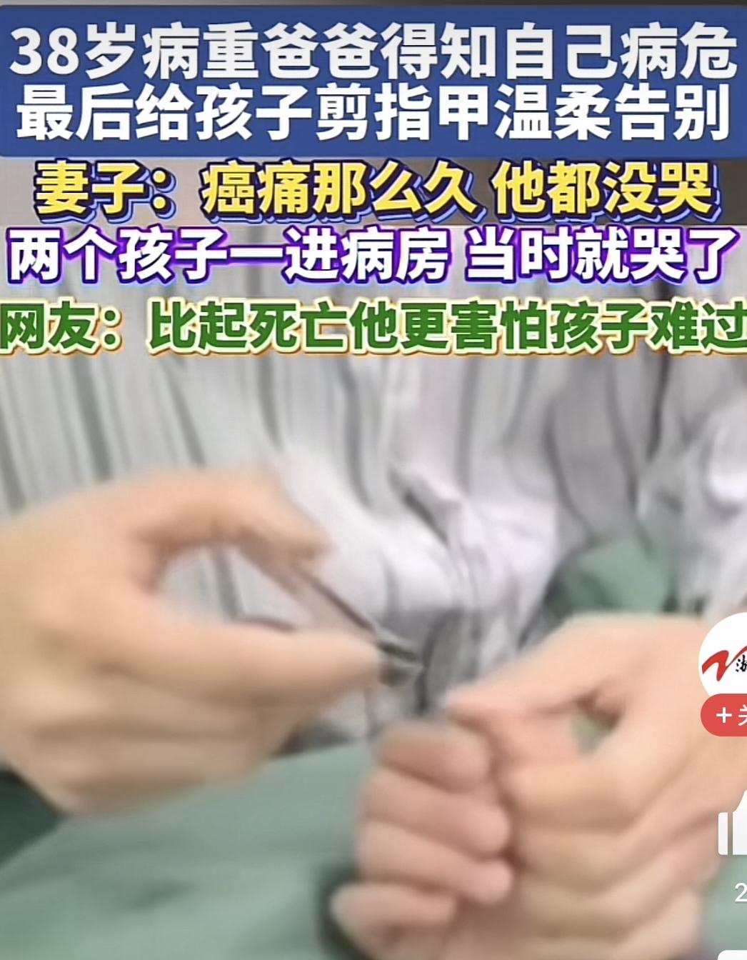 【38岁父亲的最后告别:生命的无常让人心碎】 在河北,一位年仅38岁的父亲,用生命书写了一段令人动容的最后篇章。十月初,他因肝脓肿入院,情况逐渐恶化,短短一个月后,医院下达了病危通知书。面对生命的尽头,医生问他:是选择回家,还是在医院静静离去?他没有悲伤,没有愤怒,只是静静地接受了这个残酷的现实。 然而,最令人动容的是当两个孩子走进病房时,这位父亲终于流下了眼泪。在那虚弱的身体里,他坚持为孩子们最后剪一次指甲,温柔叮嘱他们“听妈妈的话”。最小的女儿天真无邪地点点头,看着爸爸,或许还不懂生命的无常,但那一刻,父爱的深沉令人心碎。母亲在一旁忍着泪水,心疼丈夫的痛苦,也为这短暂而珍贵的父子时光感到心酸。 几天后,丈夫再次呼唤妻子,却已说不出话,只是用眼神表达着不舍。几分钟后,他安静地离开了这个世界。那一幕,令人心碎得无法言喻——一个年轻的生命,带着未了的爱与牵挂,匆匆告别。 这个故事让人深思:我们常常以为生命还很长,但其实,很多人都没有预料到下一秒会发生什么。数据显示,超过六十岁已是许多人的“长寿”,而大部分人都在生命的某个阶段成为“幸存者”。我们应该珍惜每一天,把握当下,因为生命的脆弱远比我们想象中更为脆弱。 生命没有彩排,只有一次真诚的活着。或许,我们都应该学会感恩、懂得珍惜身边的人,把爱说出口,把时间用在最值得的人和事上。你是否也在思考:我会为爱的人,留下怎样的记忆?我们都在用生命书写自己的故事,愿我们都能活得精彩而有意义。 你怎么看待生命的无常?你会如何珍惜每一天的相处?欢迎留言分享你的看法。 父爱如山 爸爸 孩子