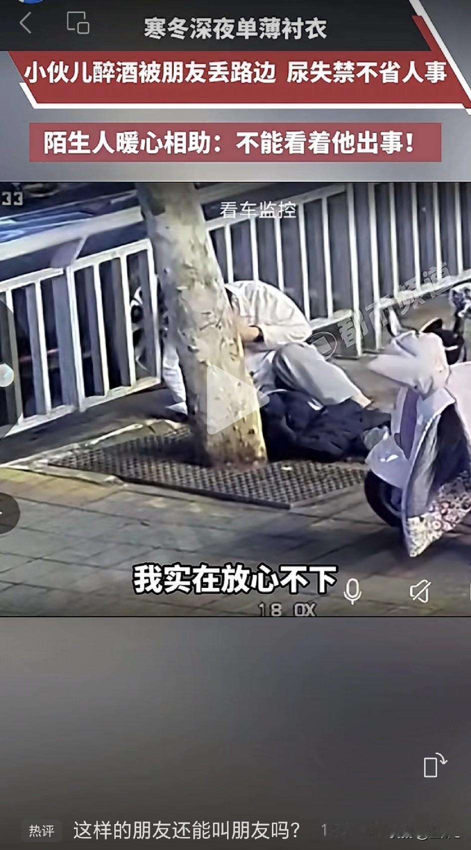 寒冬深夜小伙醉倒郑州街头,尿了一裤裆,所谓的朋友们全都溜了!路过大哥的一句话亮了…… 天寒地冻的半夜,年轻小伙穿着单薄衬衣醉倒在路边,吐了一地,尿湿一裤子。身边的朋友呢?早跑没影了。幸好一位路过的大哥蹲下身,做了件事……网友炸锅:这朋友还能要? 12月16日深夜,河南郑州的街头冷得刺骨。 丁先生路过时,看见一个年轻小伙瘫在地上,只穿件衬衣,身边全是呕吐物,裤子也尿湿了——狼狈得让人心疼。 丁先生蹲下来喊他:“朋友,醒醒!给你家里人打个电话吧?这天能冻死人啊!” 小伙醉得毫无反应。 听丁先生后来了解,小伙可能是家里有人做手术,心里难受才喝成这样。结果所谓“朋友”,直接把他扔路边,全溜了。 “想找他手机联系家人,也找不着。叫又叫不醒,没办法啊!”丁先生只好掏出手机,拨了110。 凌晨一点多,小伙的亲弟弟赶来接走了他。 事后丁先生说得实在:“都是普通人,谁还没个有难处的时候?能帮一把就帮一把。” 评论区的网友们直接气炸了: 🔥“朋友?这叫哪门子朋友!绝交吧!” 🔥“出事了才知道身边是人是鬼,这次也算看清了。” 🔥“喝酒解决不了事啊兄弟!但真谢谢好心大哥。” 🔥“世界破破烂烂,总有人替你缝缝补补。” 🔥“我上次也帮一个醉汉报了警——举手之劳,说不定救条命呢!” 🔥“人生低谷的时候,千万不要和损友相聚!” 🔥“经历过的才能看清什么叫朋友,小伙子清醒点吧!” 🔥“朋友还不如路人,那还算什么朋友?” 人生难免低谷,但选对朋友很重要——有的朋友陪你喝酒,有的朋友把你丢在街头。 还好,这世界总有陌生的手,愿意在你狼狈时拉你一把。 醒了之后,记得两件事:一是谢谢那位寒夜报警的丁大哥;二是……那帮“朋友”的电话,该删就删了吧。 信息来源于都市频道,侵联删!