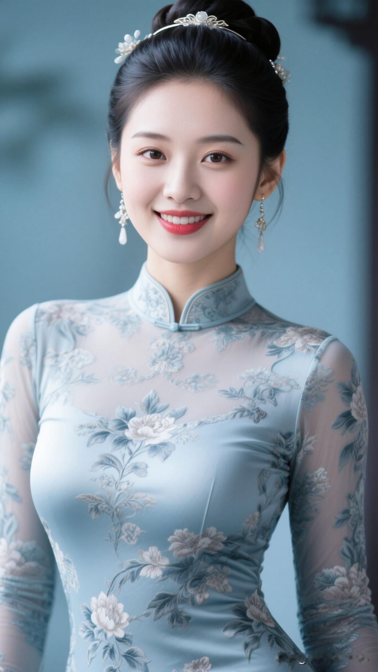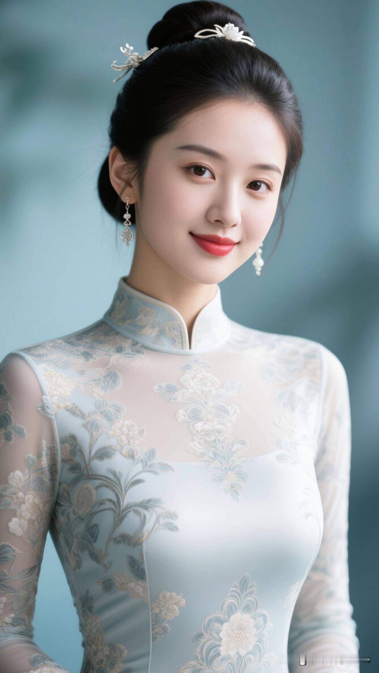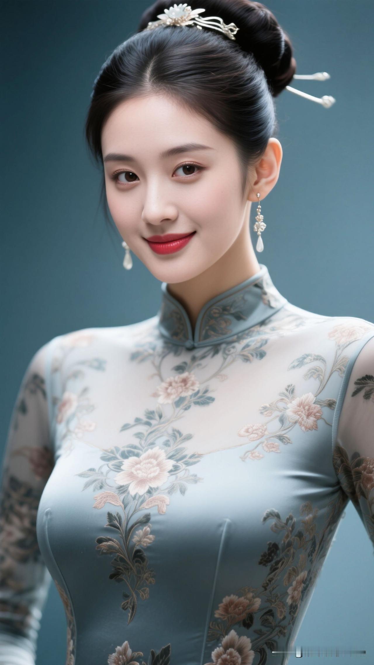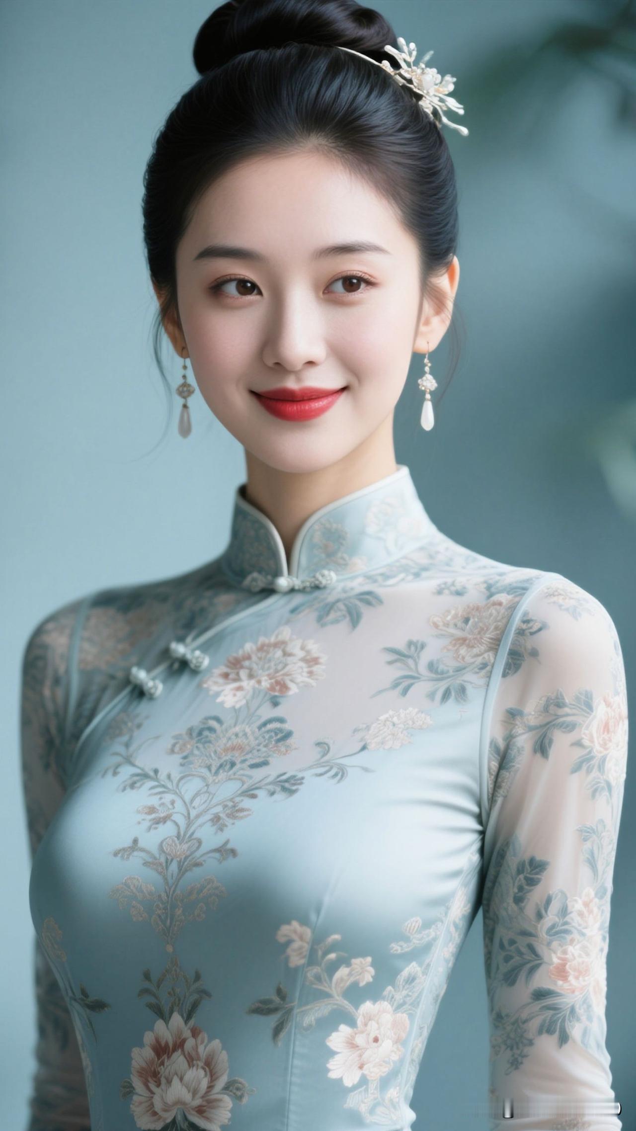 ✨ 雾蓝旗袍裹住春水的静,牡丹在襟间绽成画,银饰垂着月的韵,她站在那里,就是古典