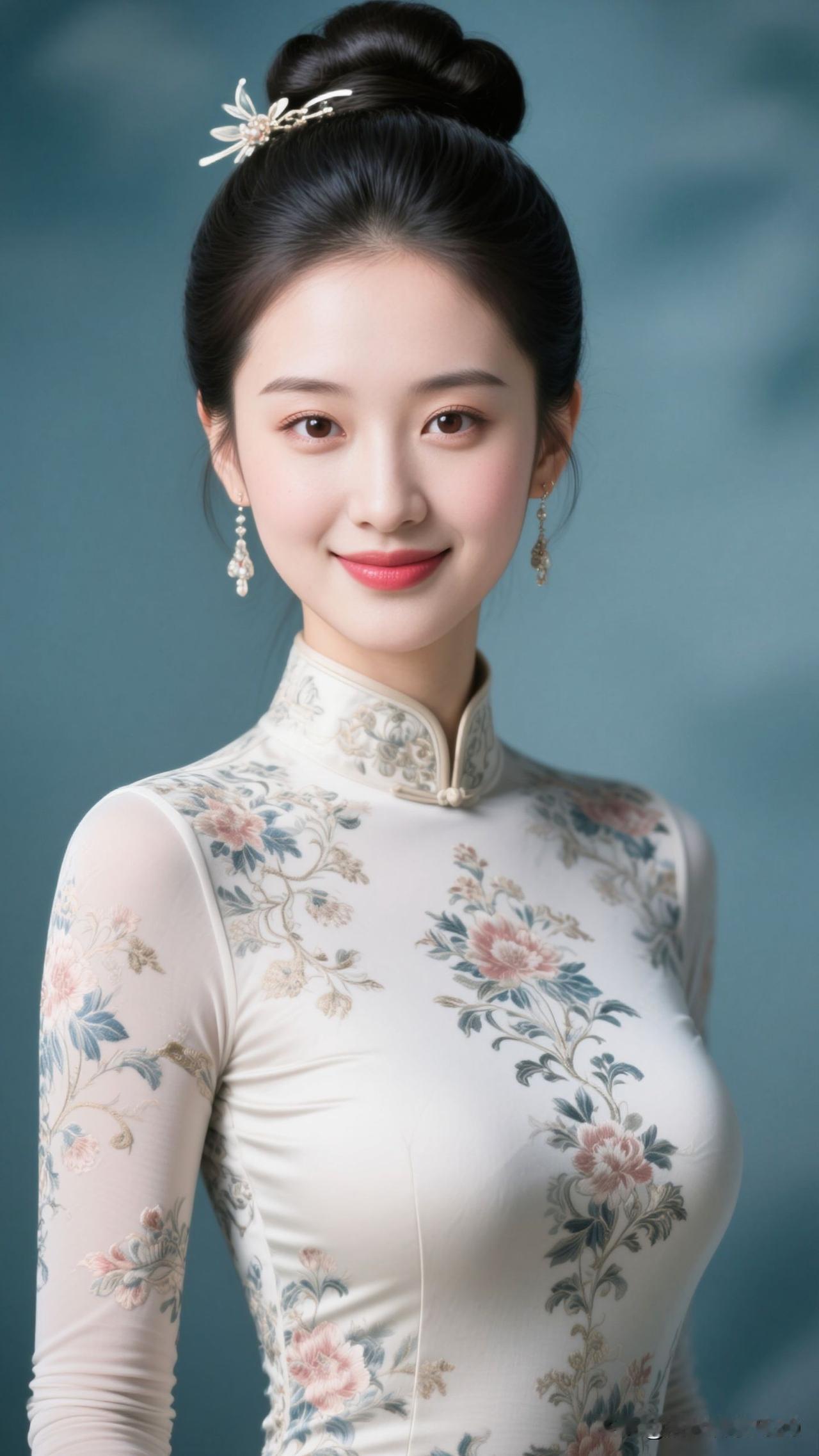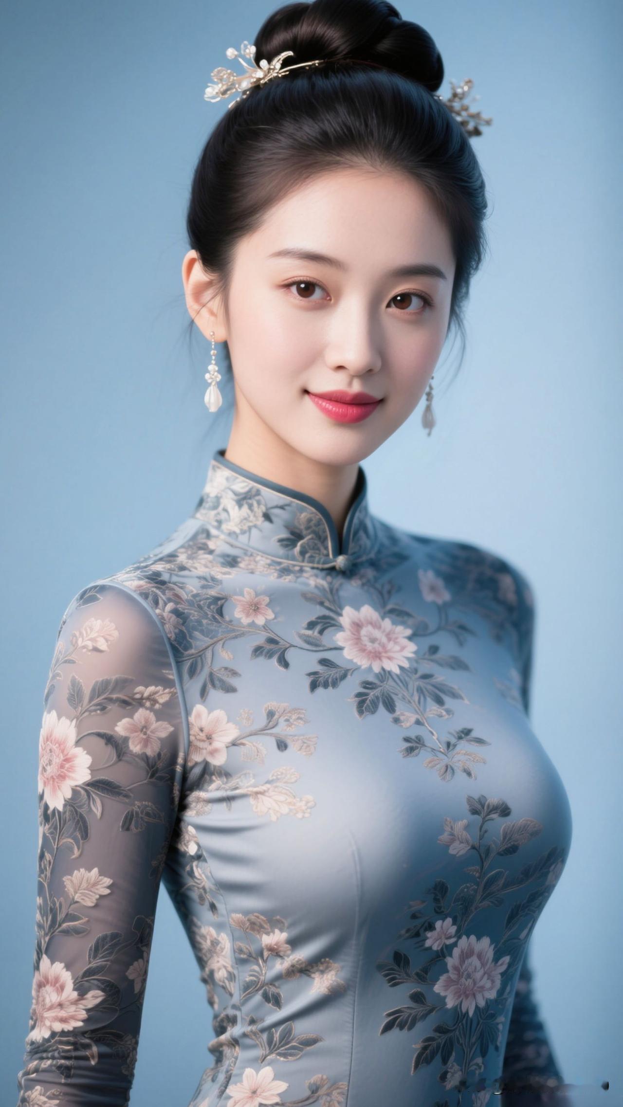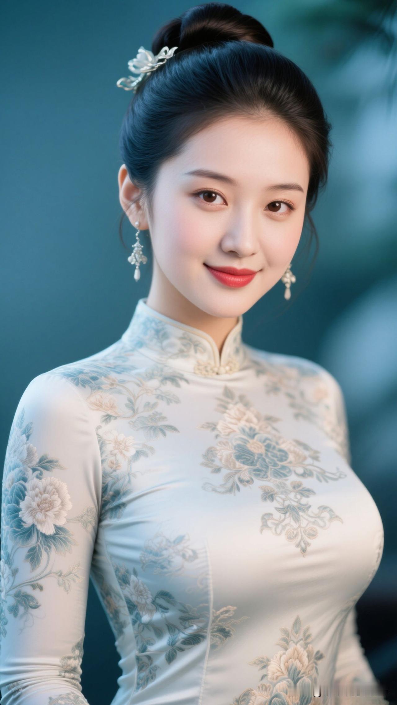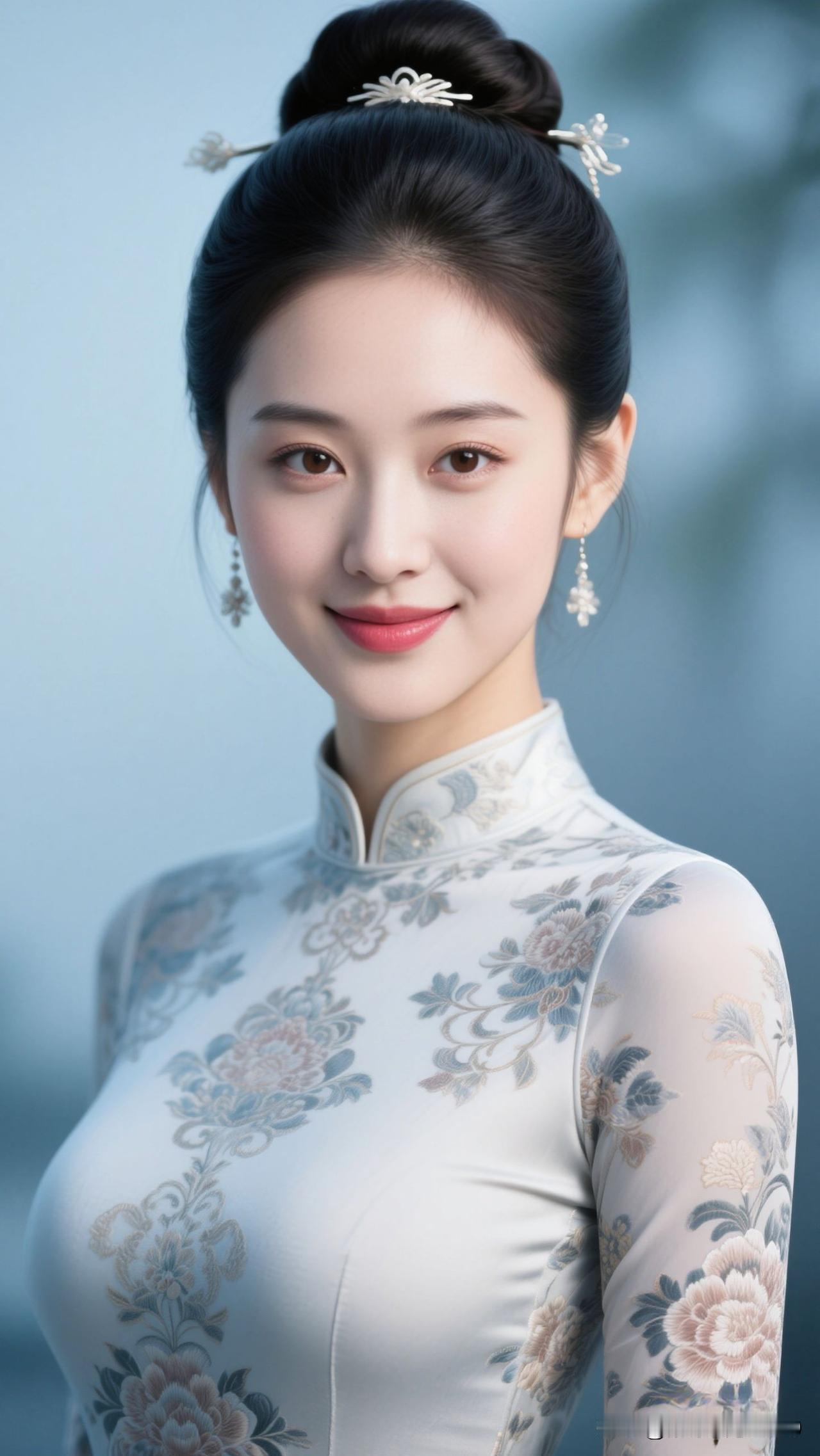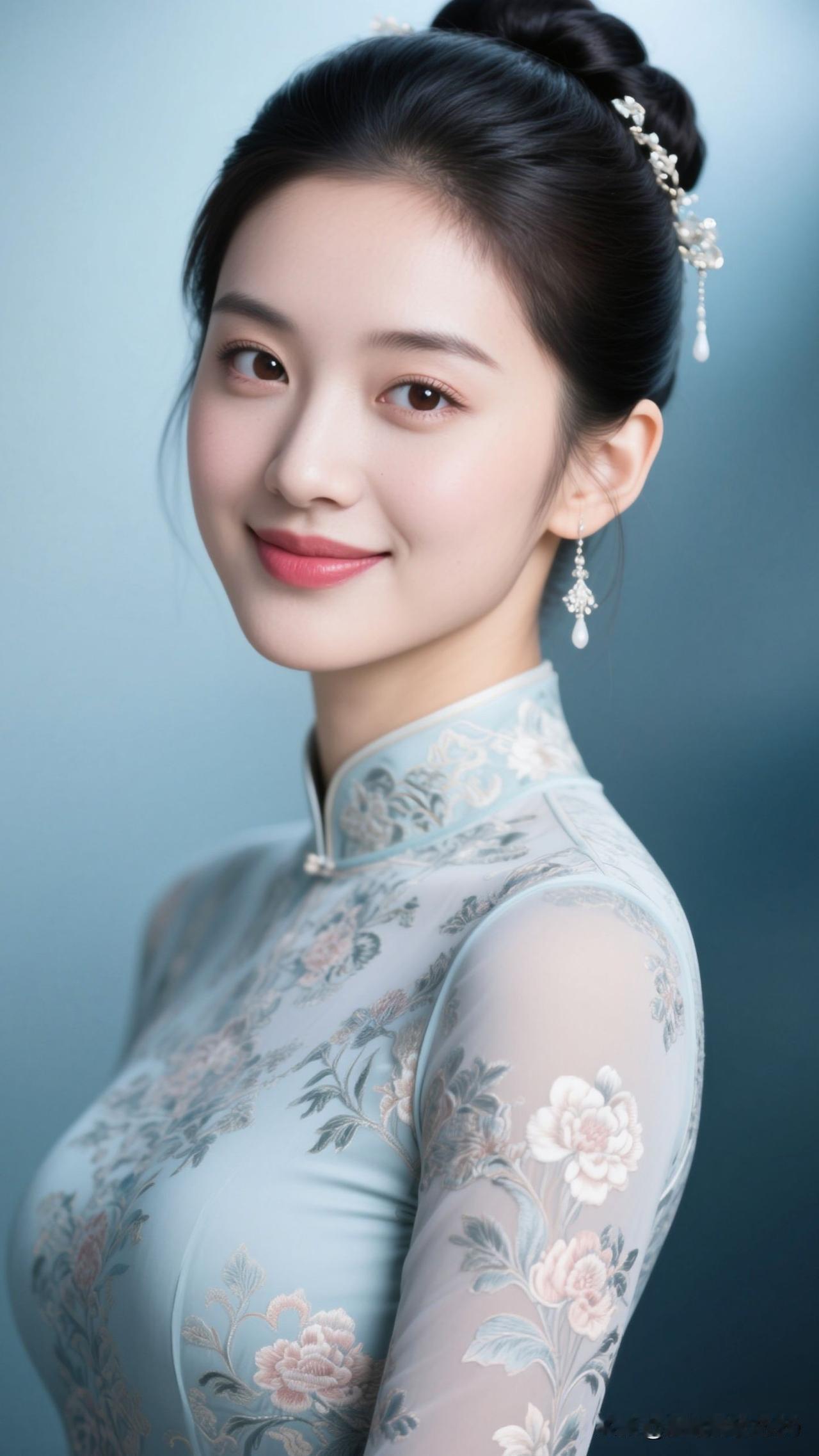 ✨ 雾蓝旗袍裹住春水的静,牡丹在襟间绽成画,银饰垂着月的韵,她站在那里,就是古典