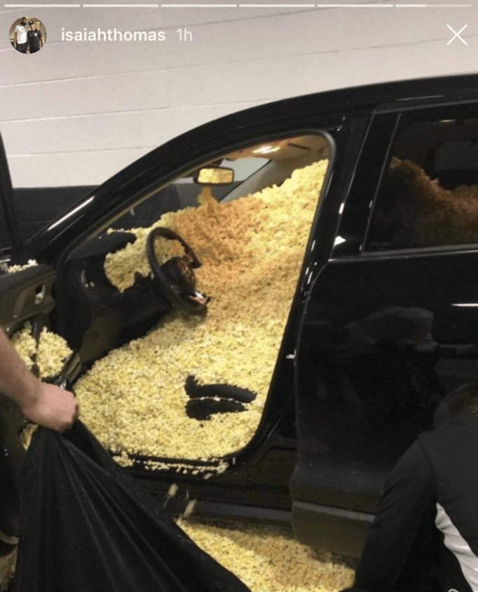 杰伦-布朗在赛后采访中被问及在场边观看比赛的以赛亚-托马斯面前赢得比赛的感受:“他真是球队的传奇人物,但我到现在还耿耿于怀他用爆米花喷我的车。”