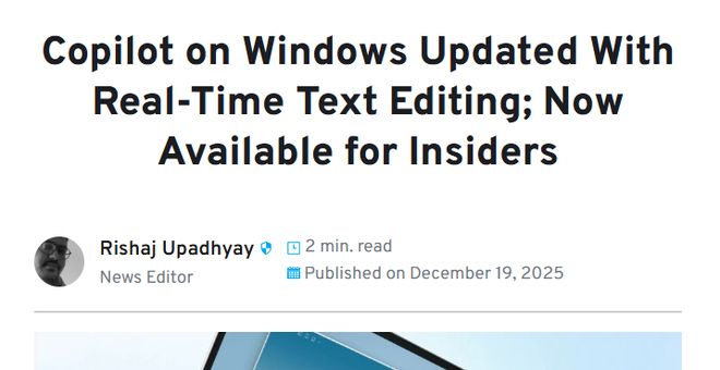 [环球网科技综合报道]12月20日消息,据WindowsReport报道,在Copilot新版本中,微软推出CopilotActions实时文本编辑新功能。