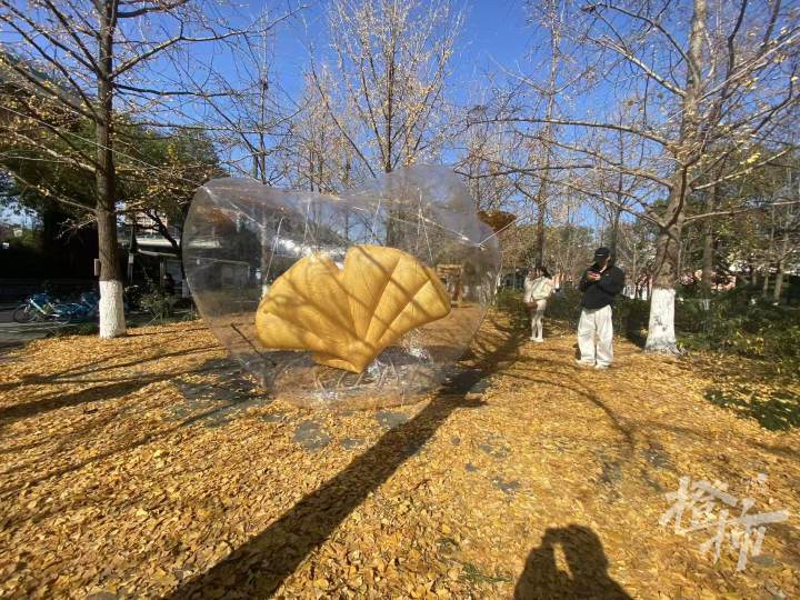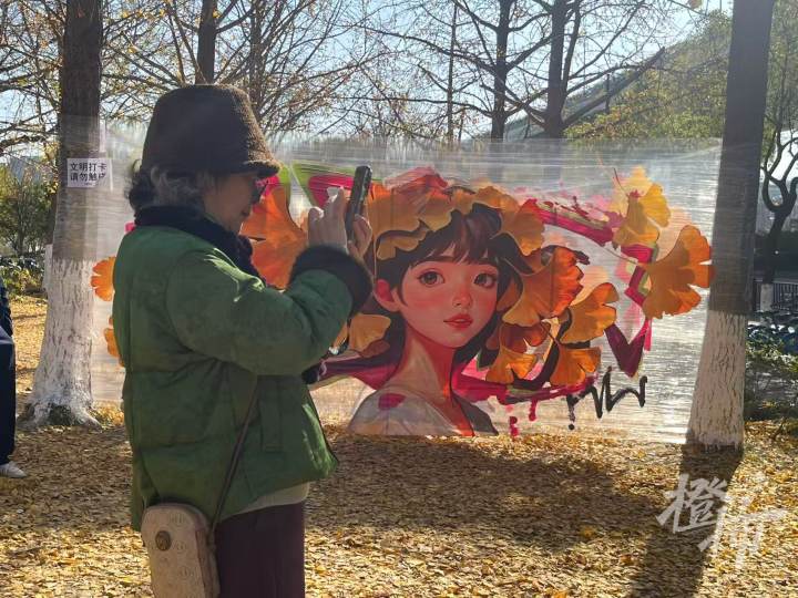 橙柿记者了解到,吸引游人络绎不绝来打卡的,是这片银杏林中的“落叶不扫”的艺术展。