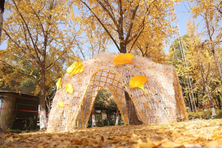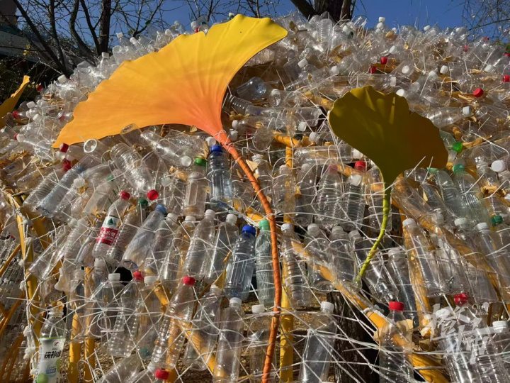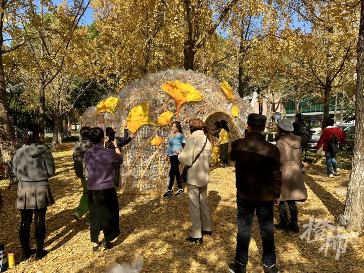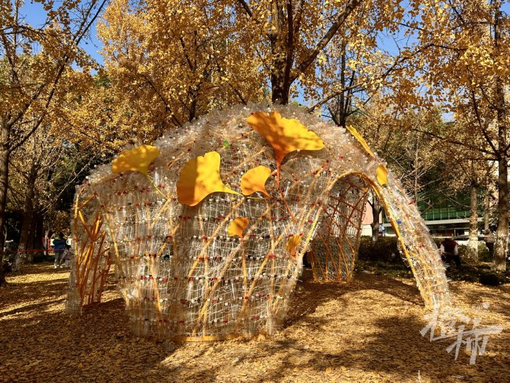 橙柿记者了解到,这片银杏林里一个个鲜活的落叶装置,都由再生资源可回收物演变而来。