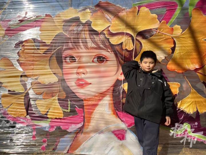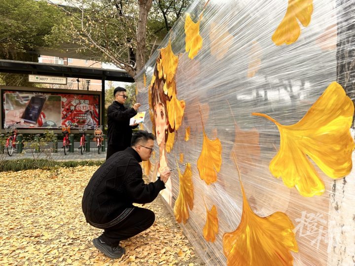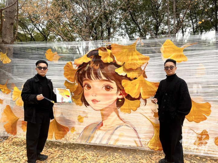 记者在现场看到,这幅《秋叶少女》装置用落叶和可回收聚乙烯搭建,“欢喜兄弟”用环保绘画颜料,以秋日银杏为笔,将金黄叶片铺成流动花墙,少女神态妩媚,身影轻倚其间。