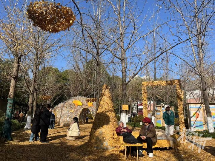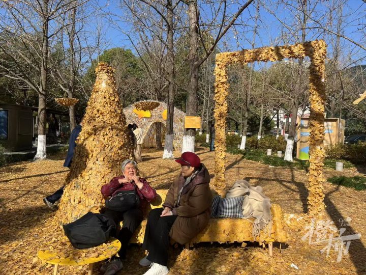 这些装置落成后,记者看到了最动人的画面:孩子围着鸟巢奔跑,少女们在落叶客厅前合影,老人拿着精致的落叶帽子细细观赏……
