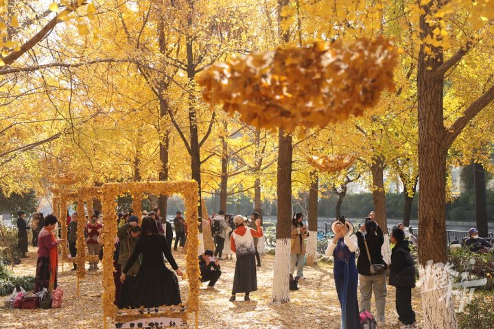 “今天虽是周末,但来的人还不是最多,人流量最多的是前几天,那时候树上的银杏叶多,非常好看,而现在掉落得差不多了。