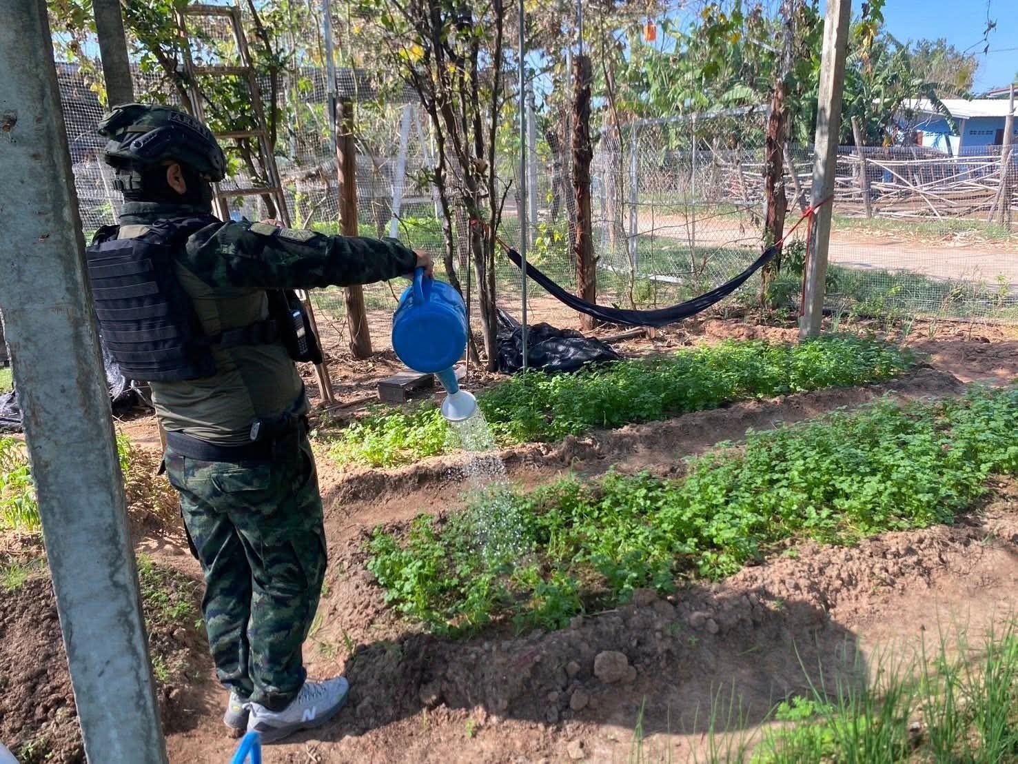 泰国皇家陆军东部司令部组织人手前往因近期边境冲突离家避难的农户家中给作物浇水以及