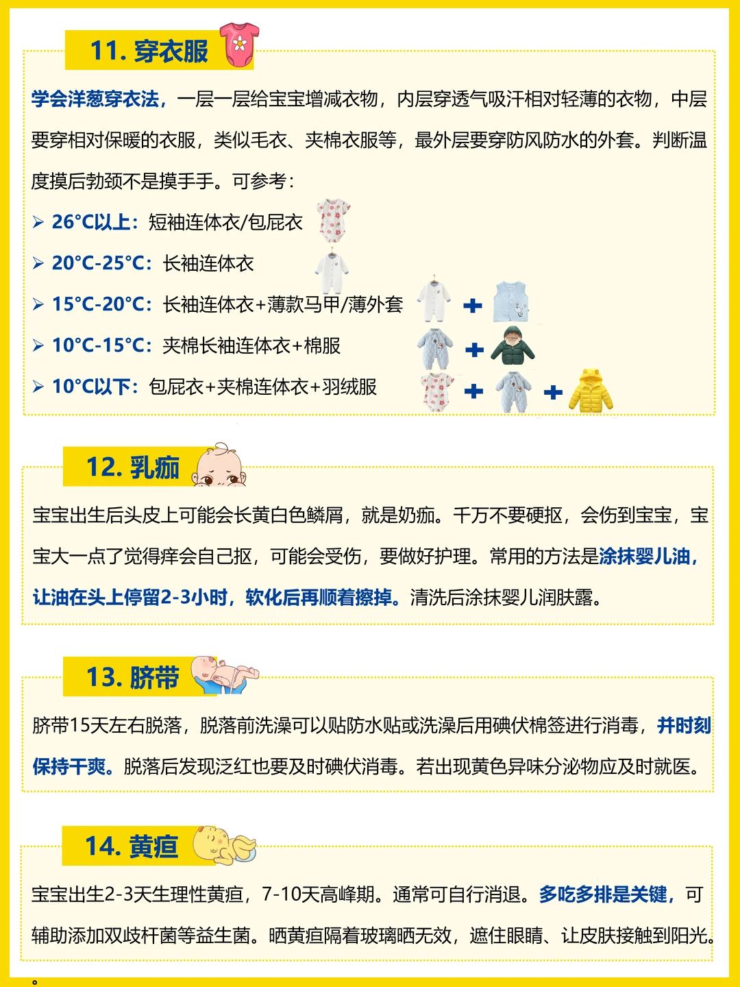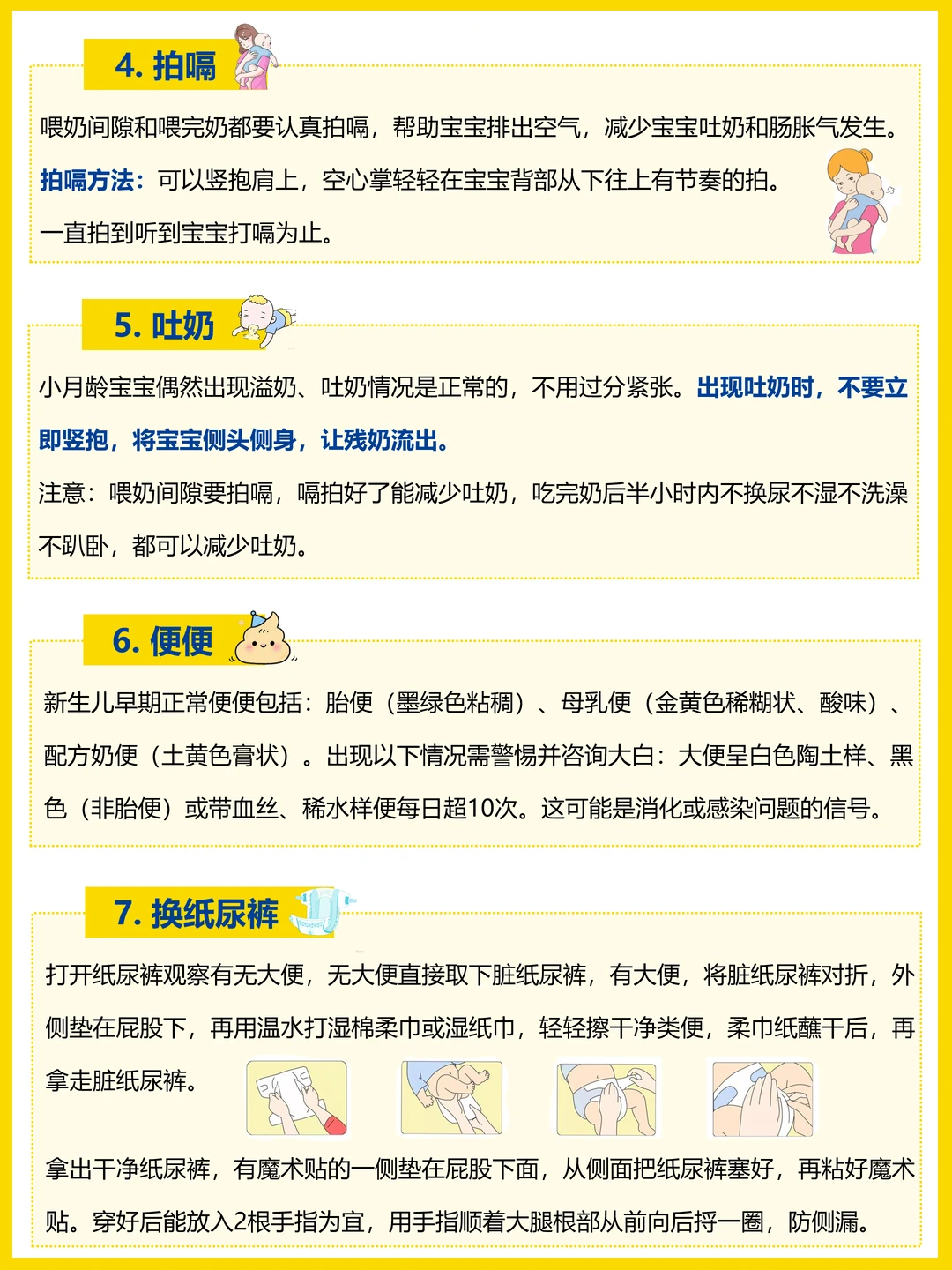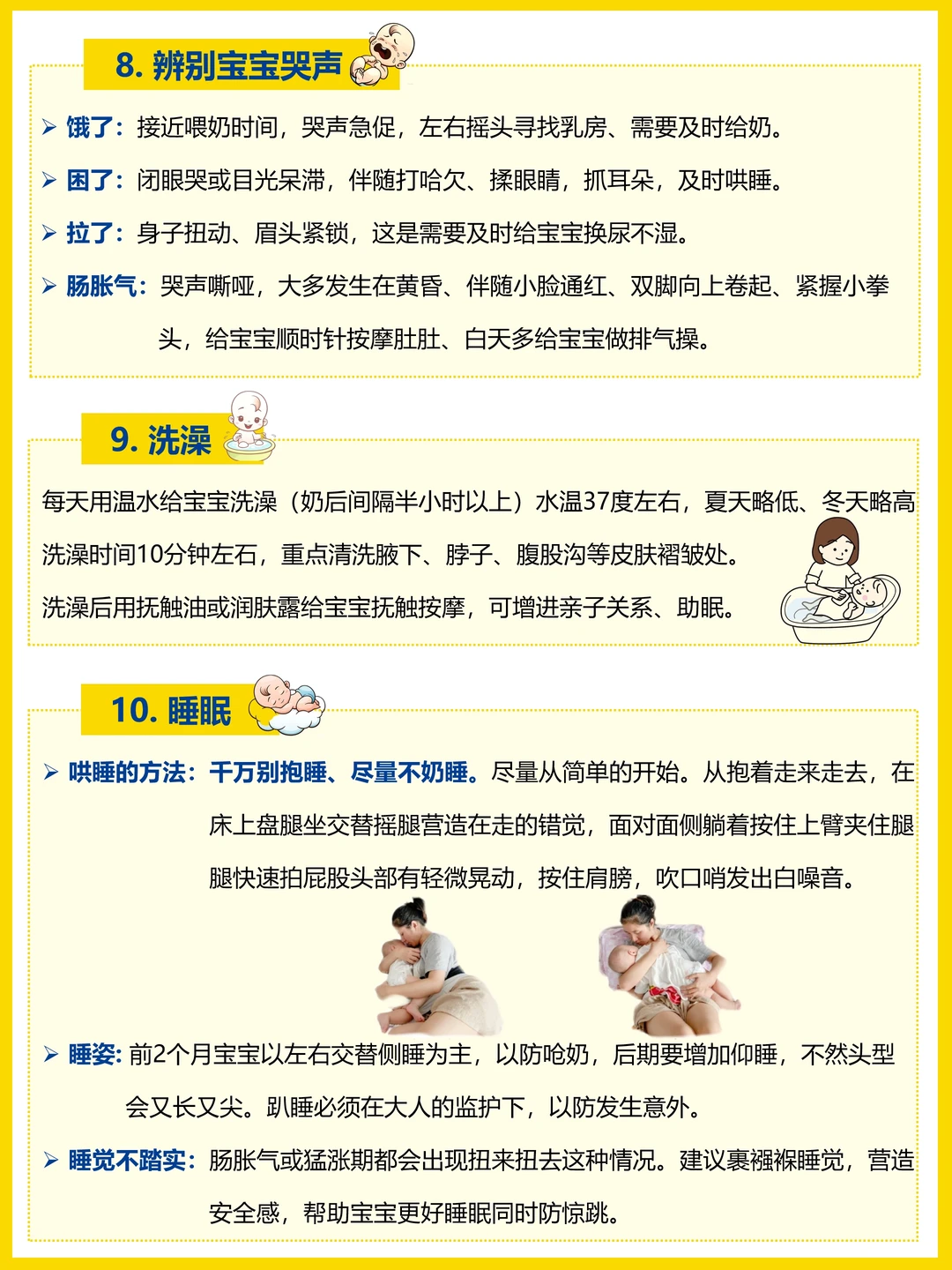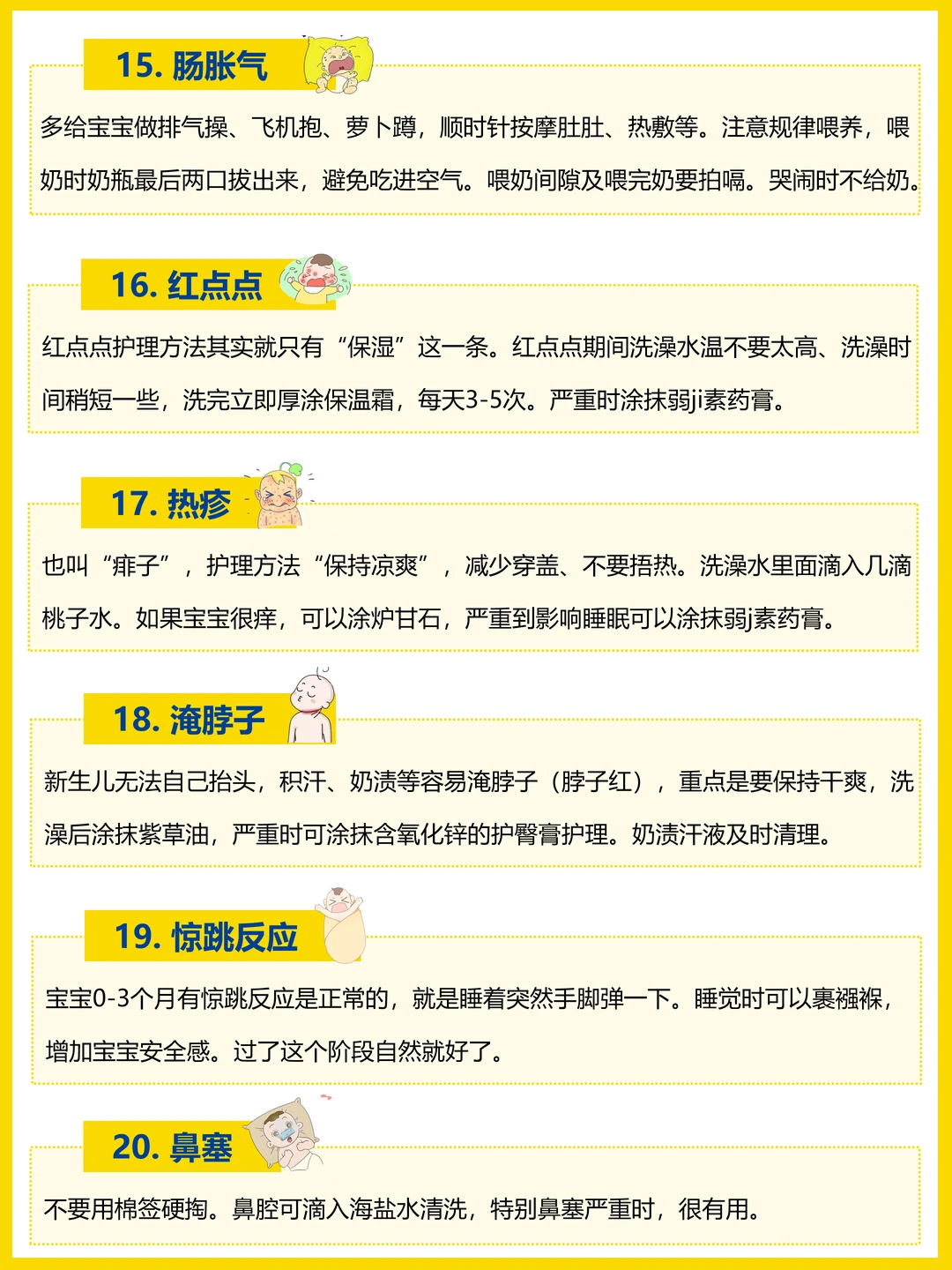 抱宝宝、母乳喂养、奶粉喂养、拍嗝、吐奶、换纸尿裤、便便、辨别宝宝哭声、洗澡、睡眠、穿衣服、乳痂、脐带、黄疸、肠胀气、红点点、热疹、淹脖子、惊跳反应、鼻塞。