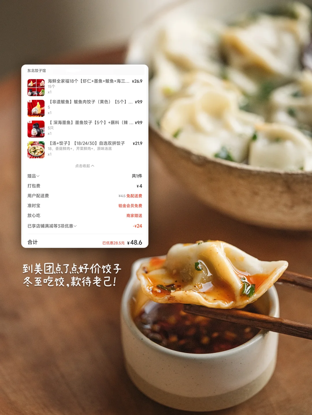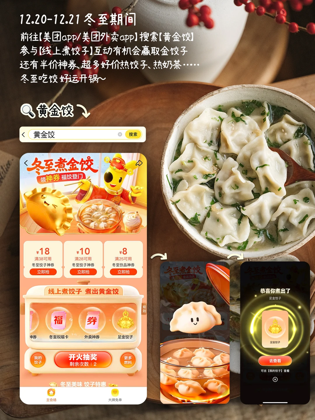 12.20-12.21冬至期间,前往美团app/美团外卖app搜索“黄金饺”,参与「线上煮饺子」互动有机会赢取金饺子。还有半价神券、超多好价热饺子、热奶茶……冬至吃饺 好运开锅~