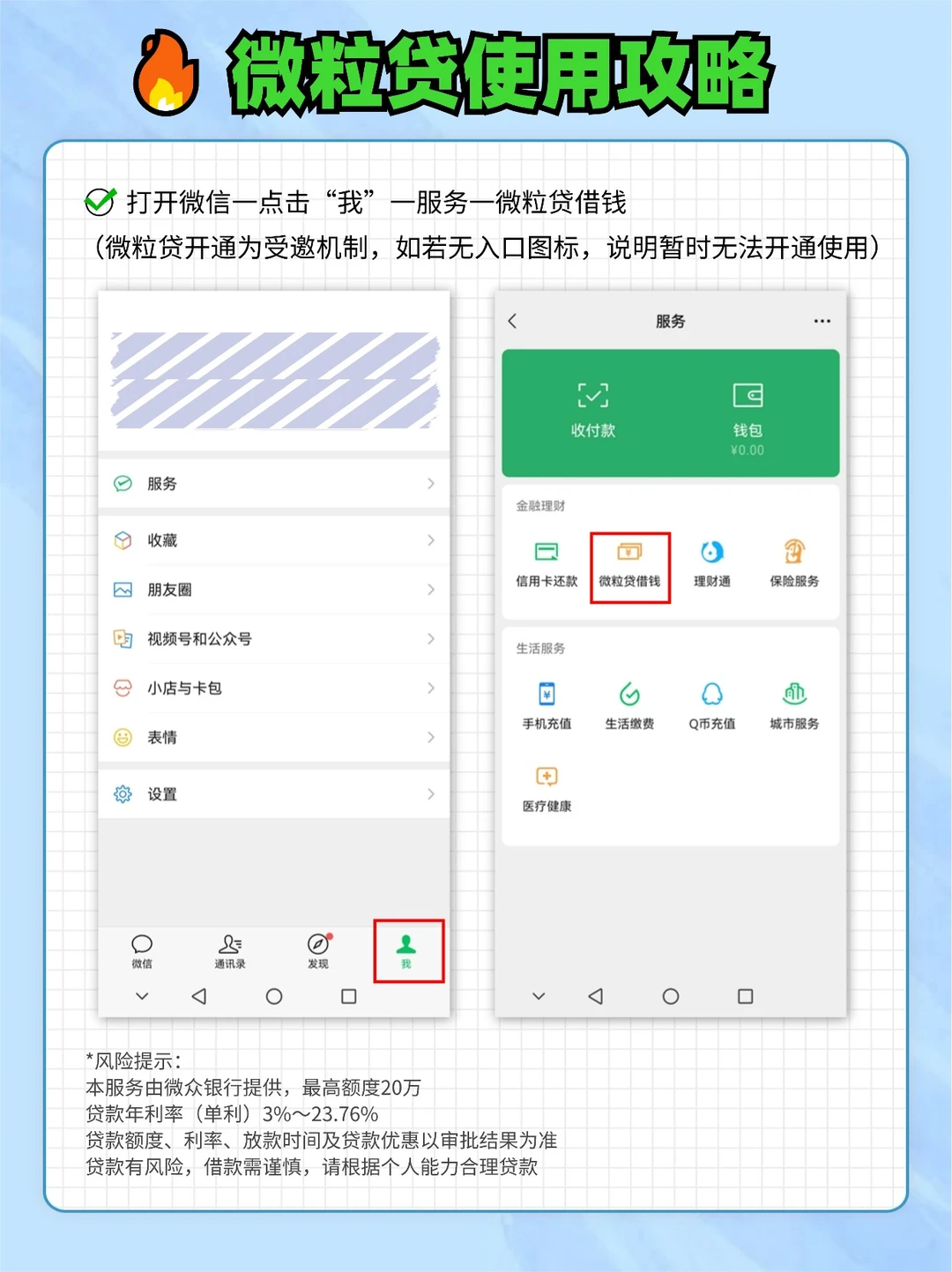方法一:打开wx一点击“我”一服务一微粒贷借钱