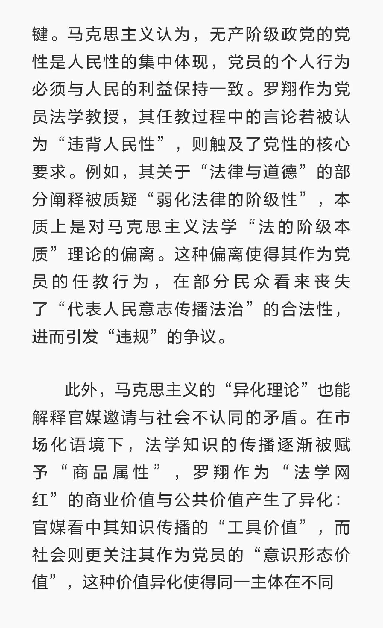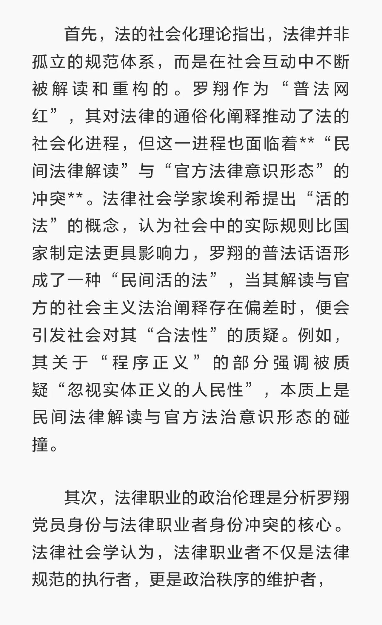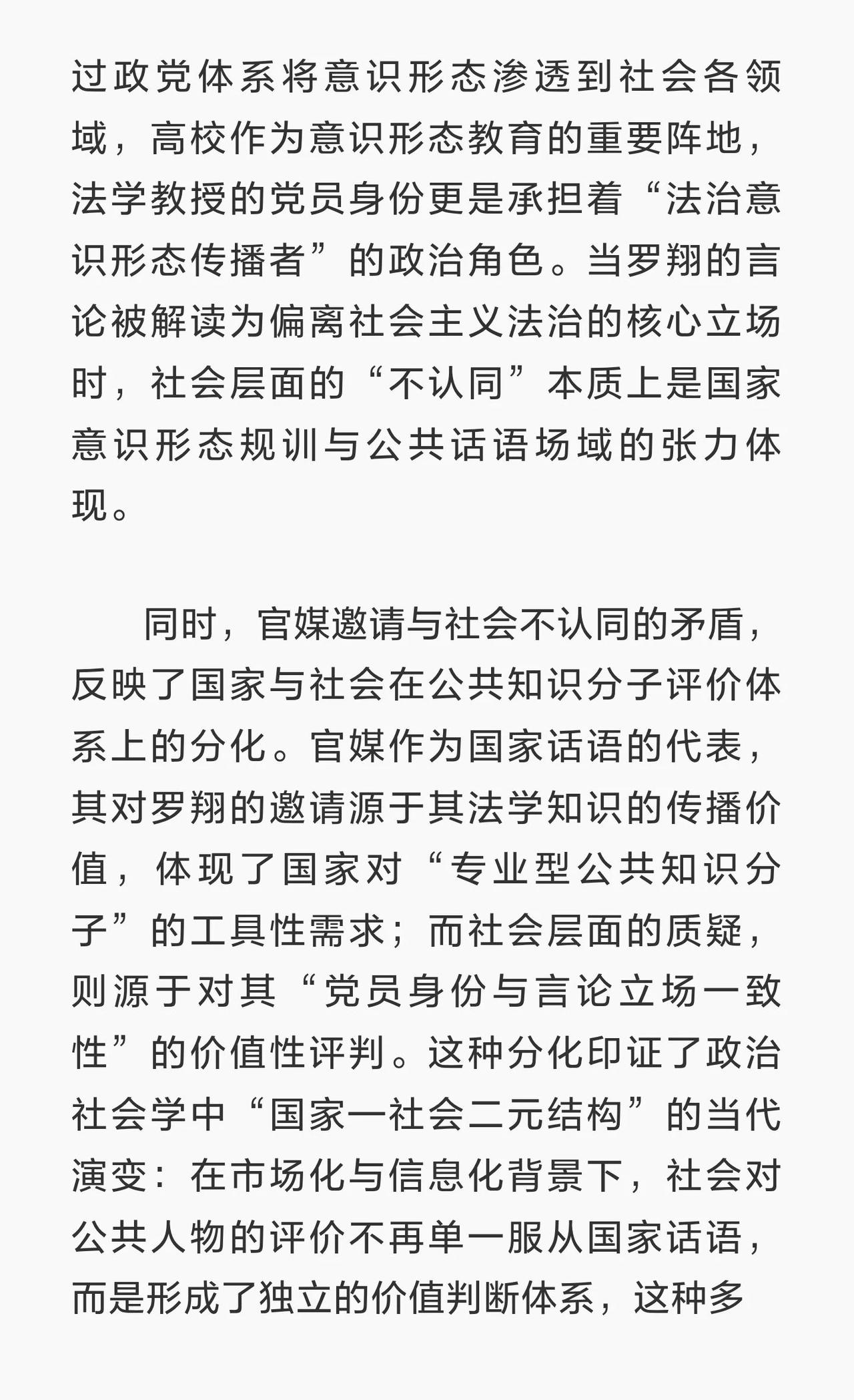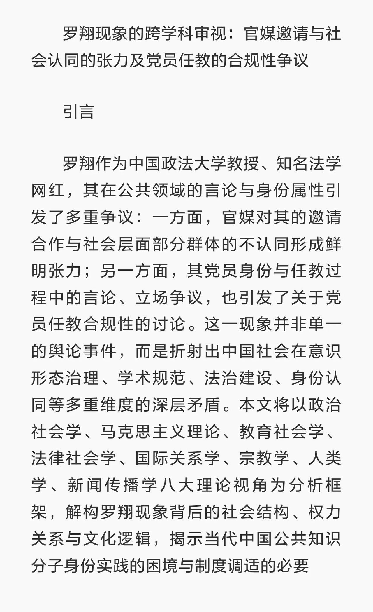 罗翔现象的跨学科审视:官媒邀请与社会认同 罗翔现象揭示了中国社会在意识形态治理、学术规范、法治建设、身份认同等领域的深层矛盾,涉及党员身份、学术自由、法治传播等多重张力。通过跨学科审视,需完善制度调适,平衡规训与自由,协调国家与社会,推动法治传播与意识形态建设的协同发展。