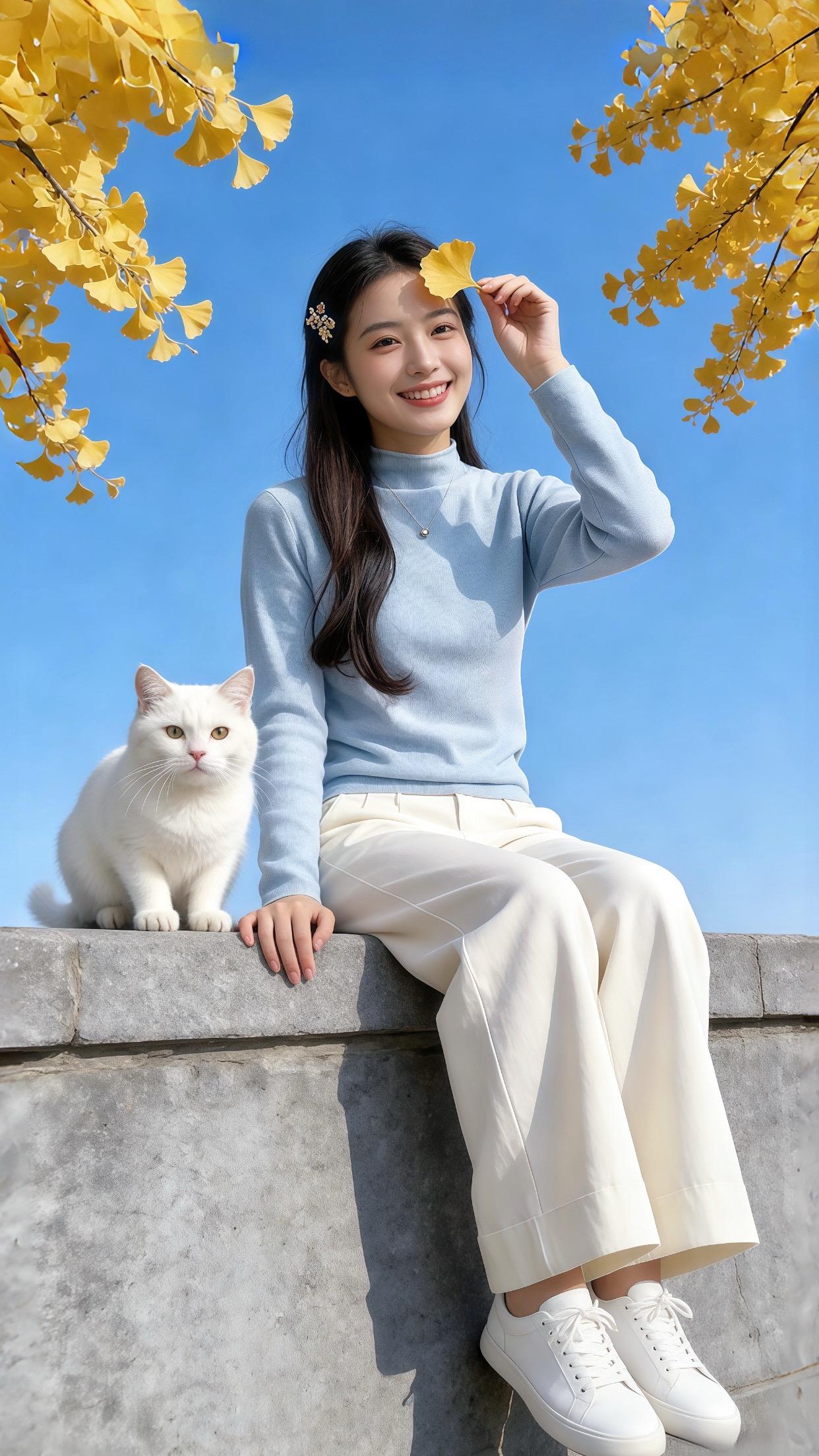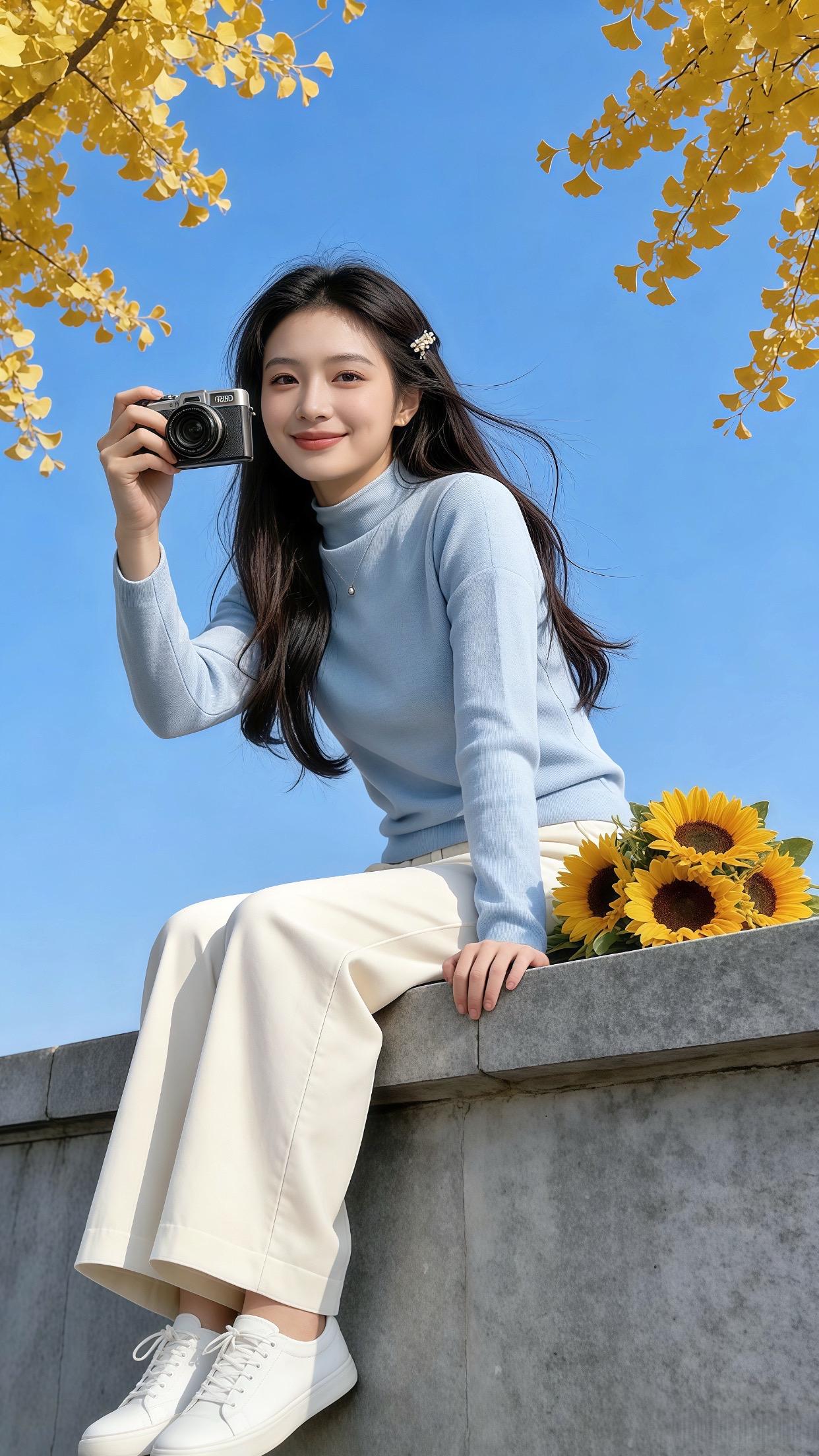 浅蓝高领打底衫搭配奶白色阔腿裤,清清爽爽的感觉像是把蓝天穿在身上,温柔...