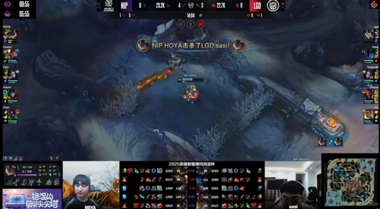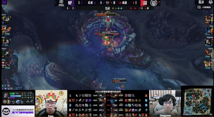 [25:04]龙魂团,LGD直接拿下水龙魂!Guwon杰斯抢龙失败自己和Zhuo牛头一起白给!Tangyuan发条闪现向前补输出!这波LGD轻松打出1换4,拆掉NIP中一塔,回头拿下大龙!9K经济差了!