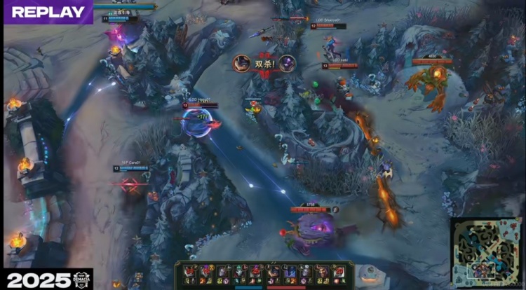 [6:50]河道双方上野2V2,没闪的HOYA兰博先倒,Heng梦魇趁着这个经验差还升6级了!自己凯旋回一口血之后关灯反手飞到了Guwon杰斯!这波Heng梦魇双杀啊!LGD的0换2!