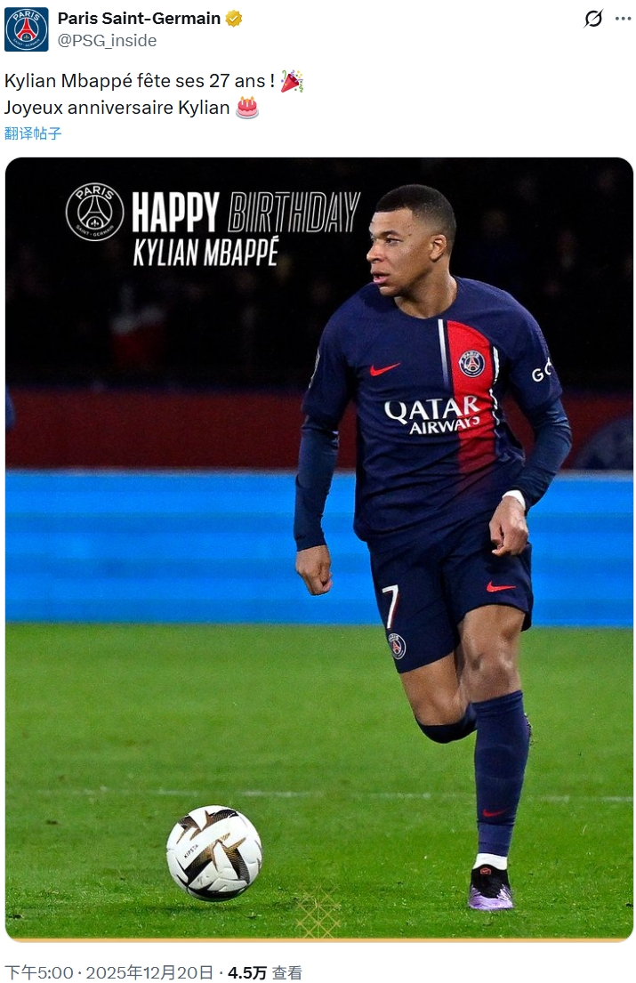 直播吧12月20日讯今天是法国前锋姆巴佩27岁生日,他的老东家巴黎圣日耳曼在社媒为姆巴佩送上生日祝福。