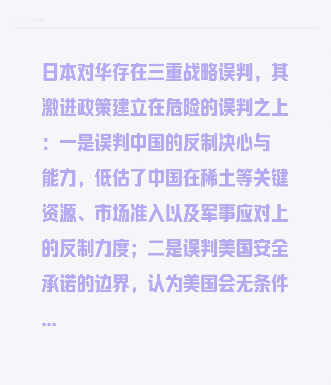 日本对华存在三重战略误判,其激进政策建立在危险的误判之上: 一是误判中国的反制决心与能力,低估了中国在稀土等关键资源、市场准入以及军事应对上的反制力度; 二是误判美国安全承诺的边界,认为美国会无条件支持其对抗中国,但美国已明确表示不希望被拖入冲突; 三是误判日本经济的抗风险能力,日本经济对外依存度高,难以承受中日关系恶化和供应链动荡的冲击。
