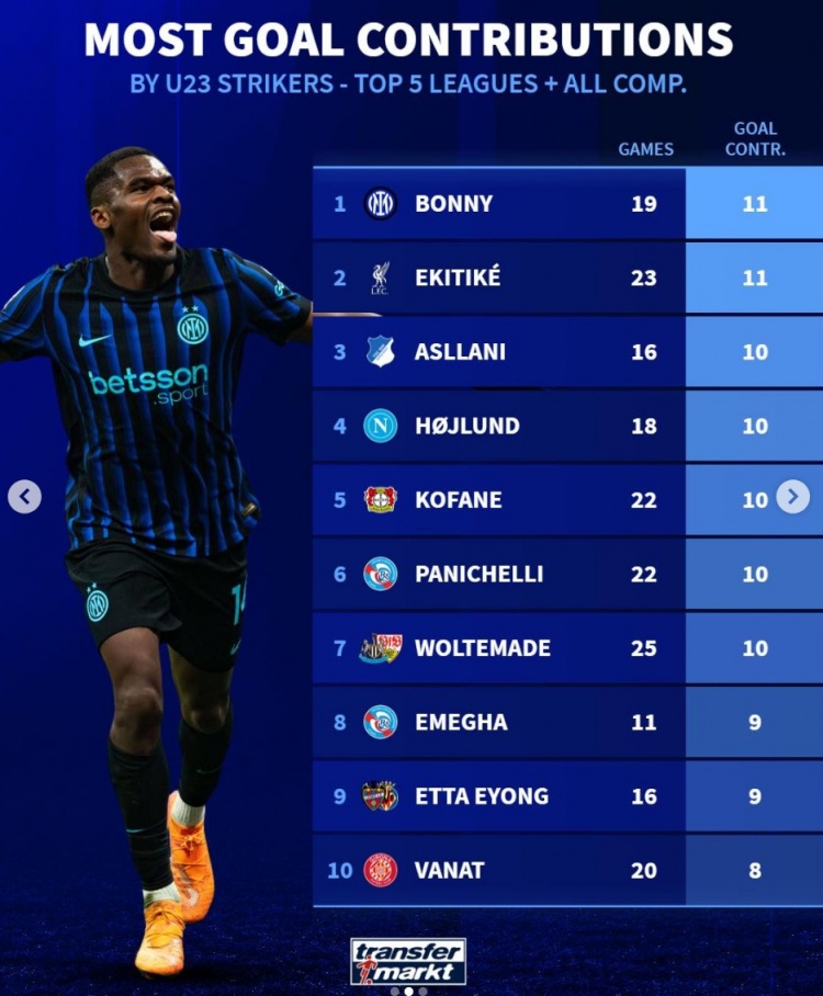 直播吧12月20日讯《转会市场》统计了本赛季五大联赛U23前锋各项赛事参与进球情况,博尼、埃基蒂克各参与11球最多。