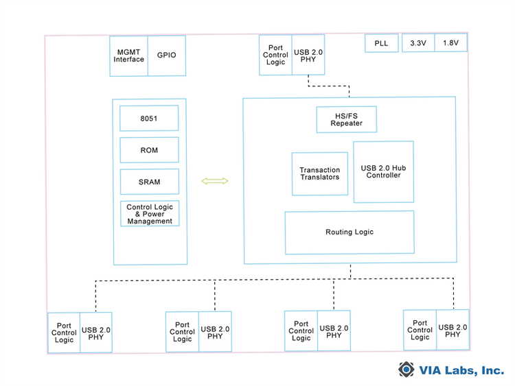VL123为即将推出的4埠USB2.0集线器控制芯片,有别于VL122的SingleTransactionTranslator(STT)架构,VL123采用了MultipleTransactionTranslator(MTT)架构,能显著提升多个USBFull-Speed装置同时运作时的传输效能。VL123支持与VL122相同的弹性化设定方案,透过SMBus或EEPROM进行管理,并与VL122封装针脚完全兼容,方便设计升级。样品预计于2026年第二季提供。