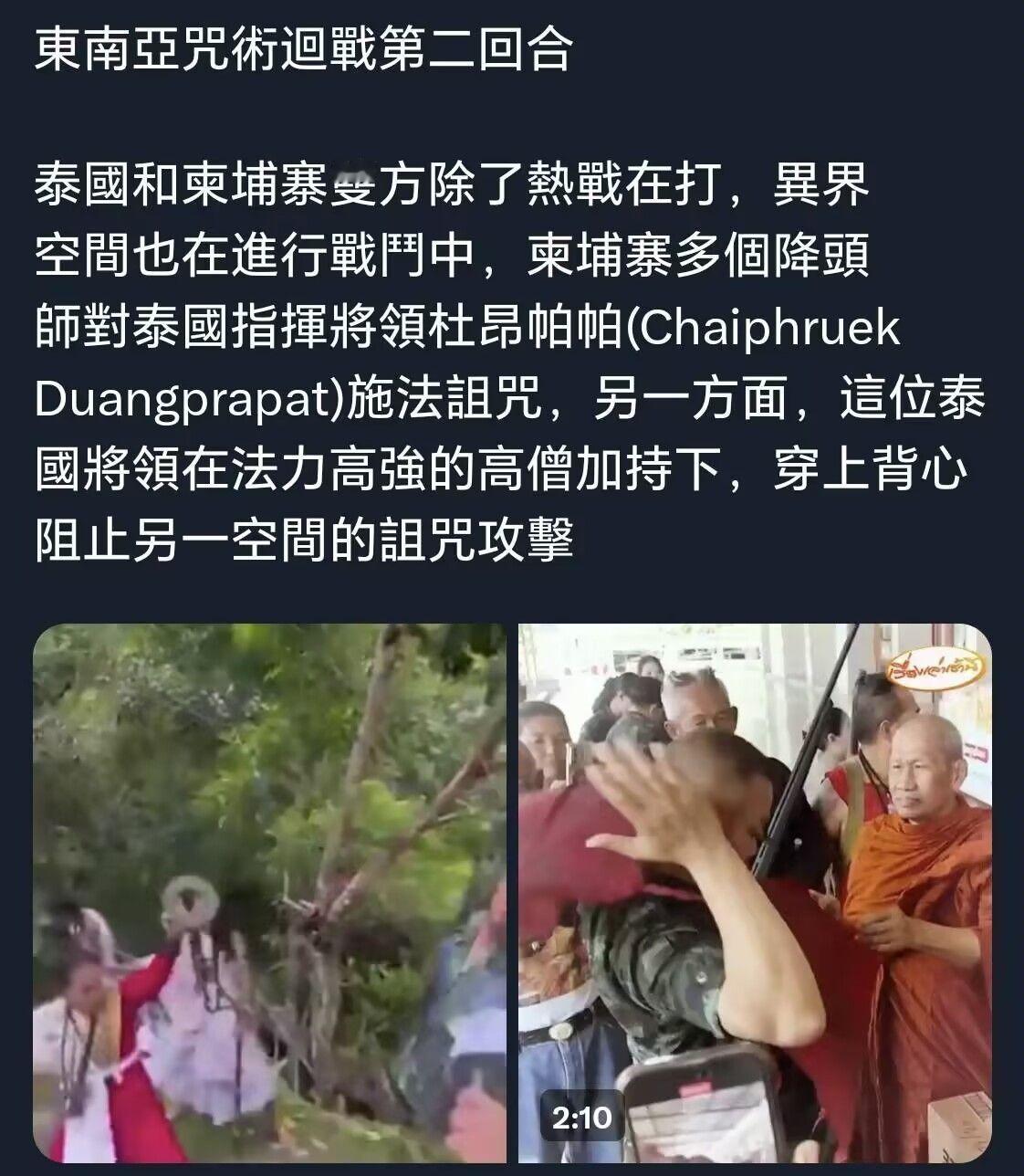 泰柬之战越来越抽象了!! 一 柬埔寨给泰国的f16下蛊,泰国高僧就去机场给F16唱麻咪麻咪哄上护体咒。 二 泰国军官穿上开光的背心,柬埔寨降头师则开启魔法攻势 ,双方以对方主将作为目标进行咒杀斗法,来分彼此修行的高低。 三 泰军彻夜播放恐怖鬼叫声,吓唬村民。
