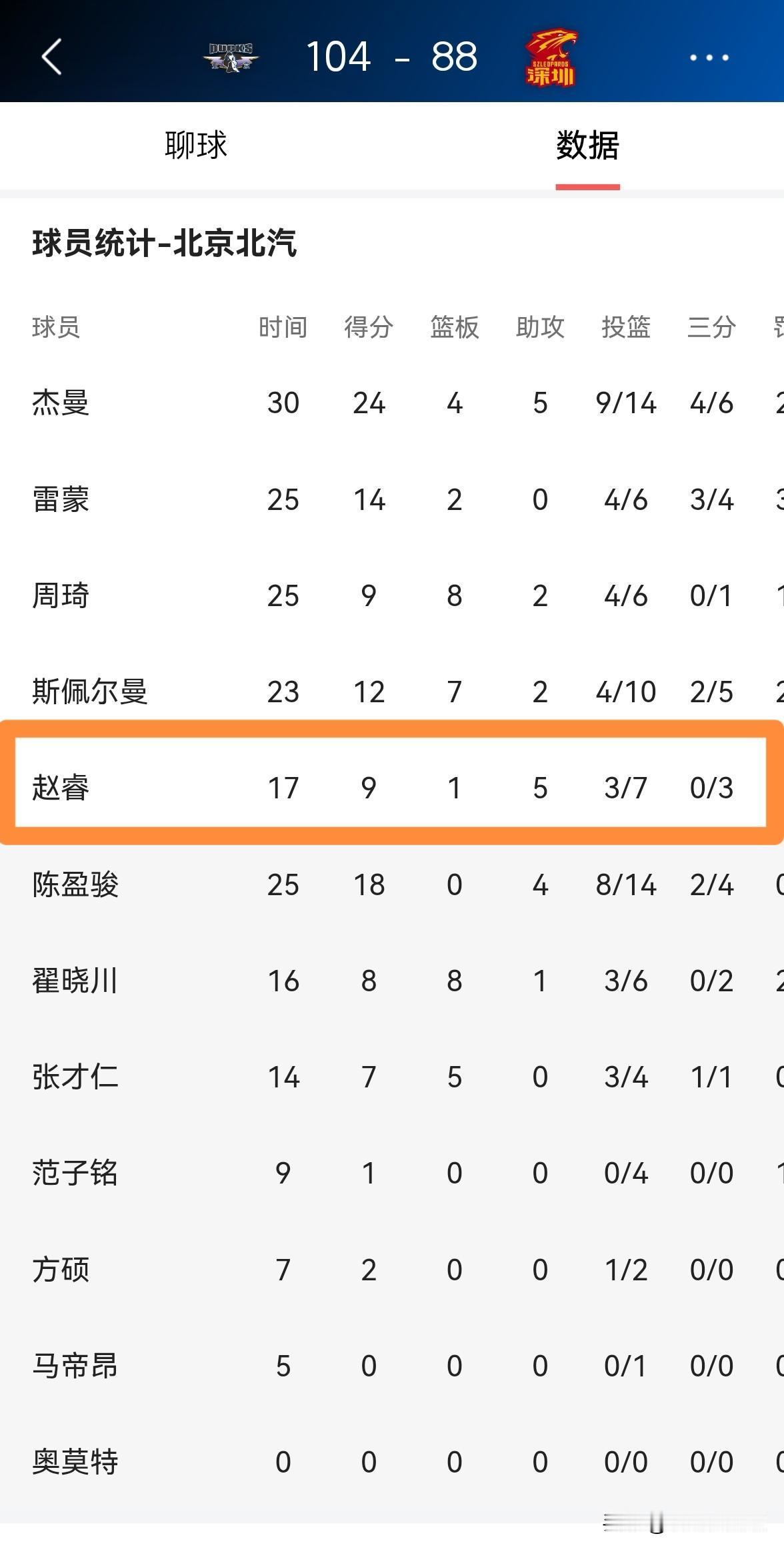北京北汽超级后卫赵睿又躺赢了!在今天北京北汽主场以104:88大胜深圳马可波罗的比赛中,赵睿仅仅首发出战17分钟,投篮7中3,其中三分球3中0、罚球3中3得到9分5助攻1抢断,他的场上正负值为+10。 由于北京北汽的整体实力远在深圳马可波罗之上,因此赵睿完全不用发力就品尝到了胜利的滋味。