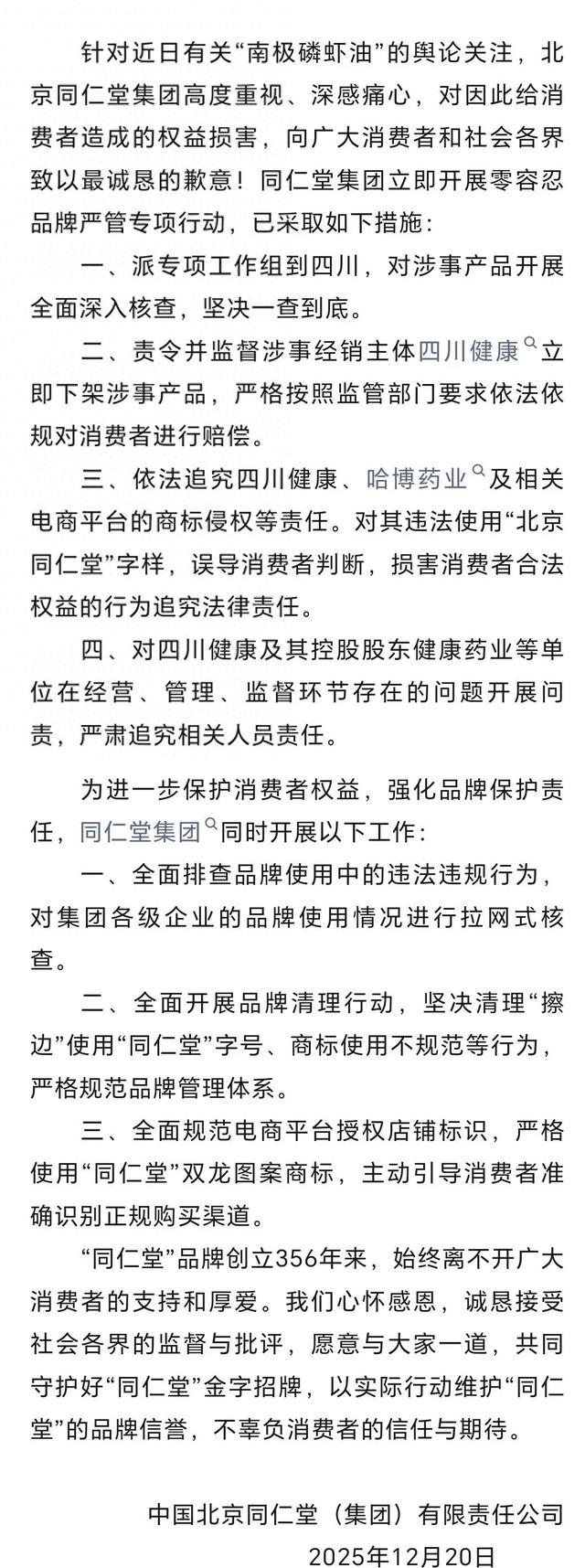 针对近日有关“南极磷虾油”的舆论关注,北京同仁堂集团高度重视、深感痛心,对因此给消费者造成的权益损害,向广大消费者和社会各界致以最诚恳的歉意!同仁堂集团立即开展零容忍品牌严管专项行动。