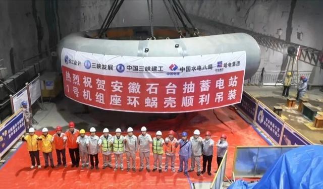 “这个座环蜗壳外轮廓约11.5米,是水泵水轮发电机组的坚实承载底座和核心过流部件。”三峡建工安徽石台抽水蓄能有限公司工程管理部工程师汪梦归介绍,蜗壳作为水轮机的引水部件,可以把水流均匀地引向水轮机转轮,其安装质量对机组稳定运行至关重要,“1号机组座环蜗壳的成功吊装,为首机发电目标如期实现夯实了基础。”