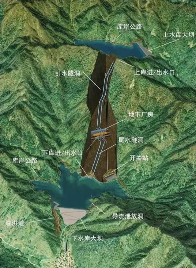得天独厚的选址让这份“充电”效率最大化——上水库正常蓄水位755米,下水库仅268米,两座大坝最大坝高分别达105米和107米,近500米的高度差赋予水流强劲动能。
