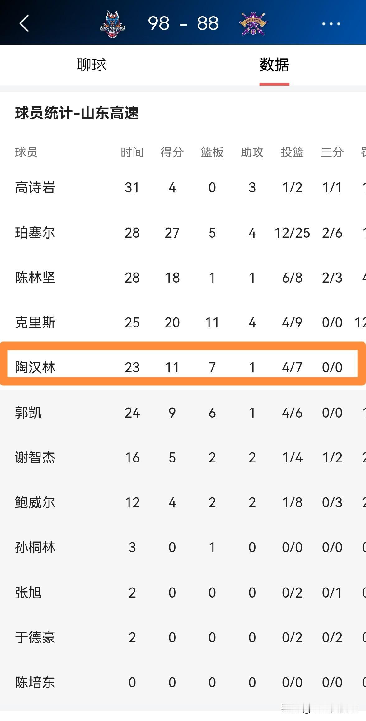 山东高速老将陶汉林真是太惊艳了!在今天山东高速主场以98:88击败北京控股的比赛中,34岁的陶汉林在攻防两端都打出了非常亮眼的表现。 全场比赛下来,陶汉林首发出战23分钟,投篮7中4,其中罚球4中3得到11分7篮板2盖帽,他的场上正负值为+4。 老实说,作为一名34岁的老将,陶汉林能够在如此激烈的一场比赛中打出这样的表现真是非常不简单。