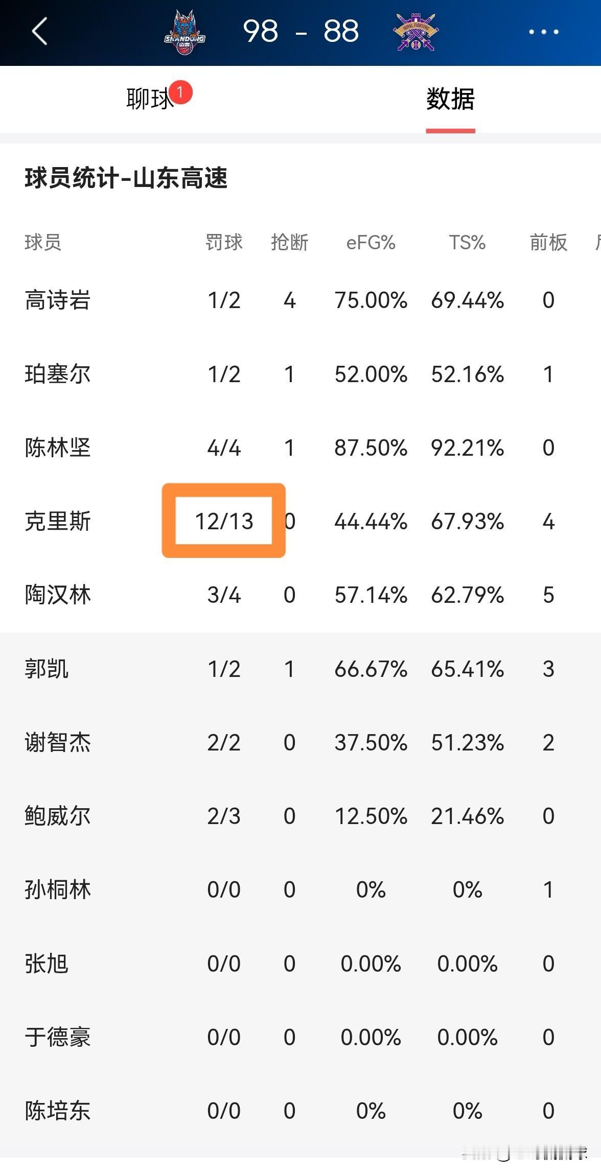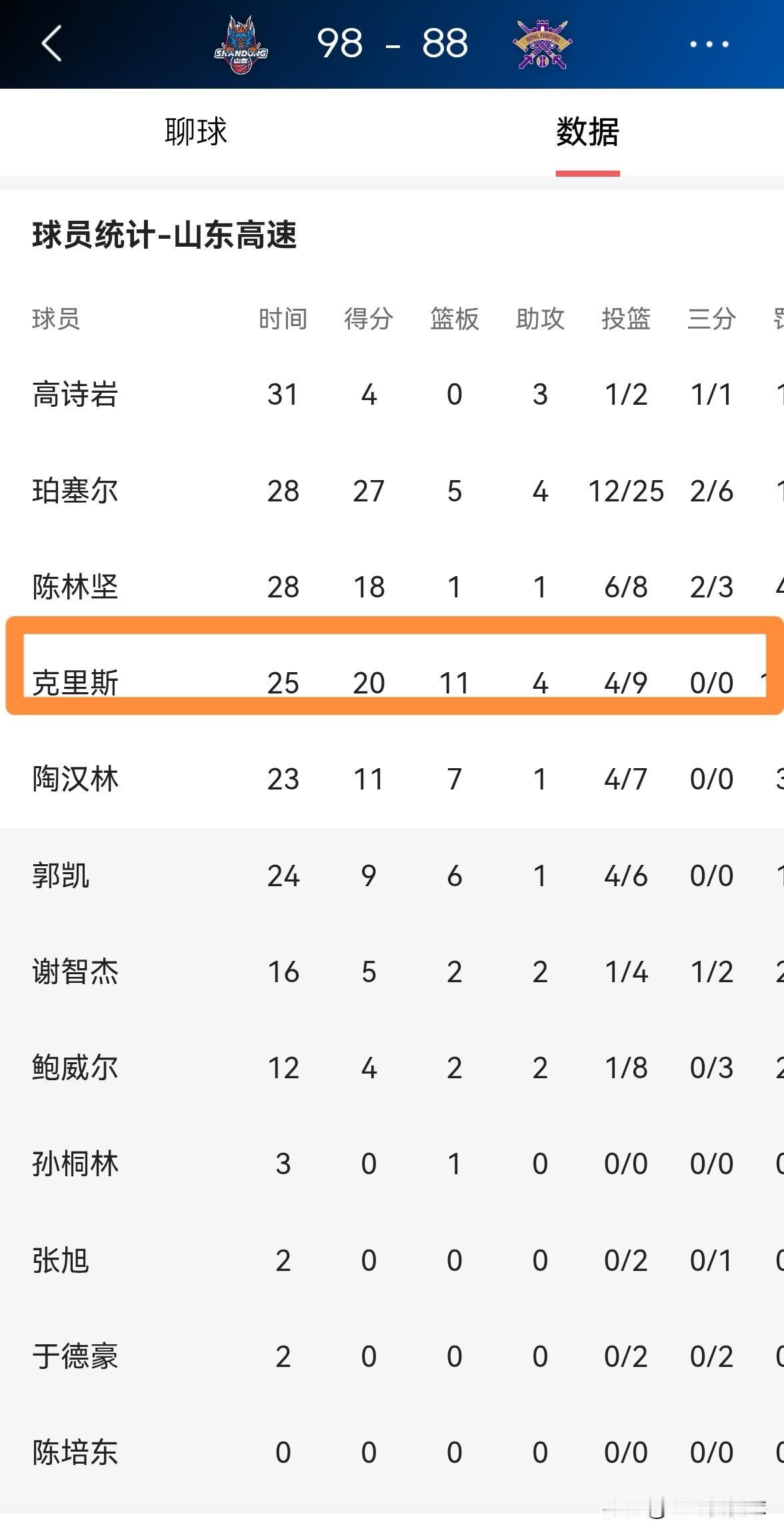 山东高速大外援克里斯真是太能罚球了!在今天山东高速主场以98:88战胜北京控股的比赛中,克里斯获得了多达13次的罚球,由此可见他在场上的冲击力有多么的强。 整场比赛下来,克里斯首发出战25分钟,投篮9中4,其中罚球13中12砍下20分11篮板4助攻,他的场上正负值为+13。 以目前的情况来看,能够和克里斯一较高下的只有山西汾酒超级外援迪亚洛了,两人的身体素质在CBA属于同一级别。