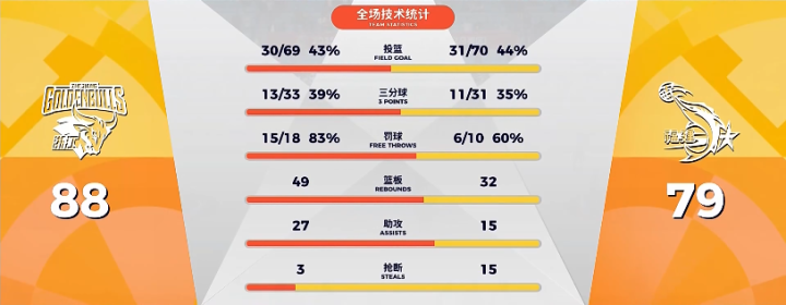 下半场上来两队手感都不理想,运动战频频打铁,第三节后半段浙江稠州频频出现失误,福建通过反击取得领先。但浙江稠州随后打出一波18-0的高潮反超比分并建立起10分优势,福建未能回天,浙江稠州88-79击败福建结束3连败,取得赛季首胜。