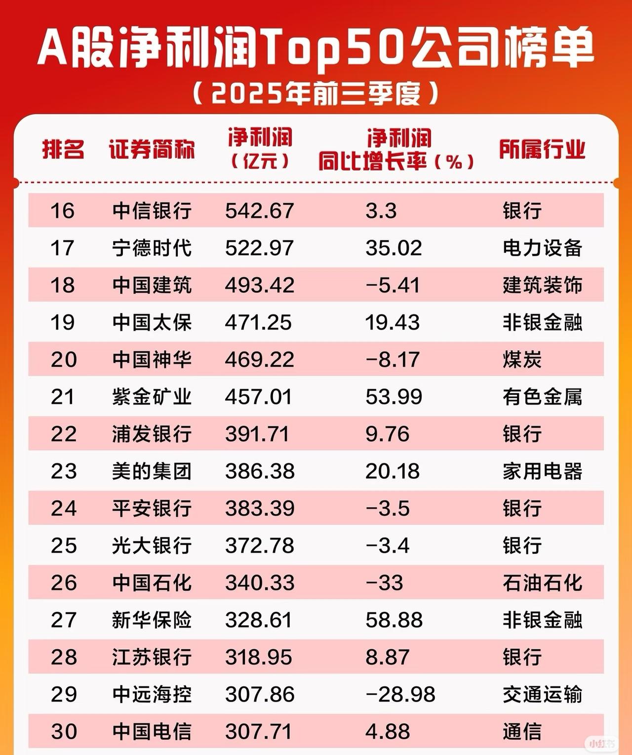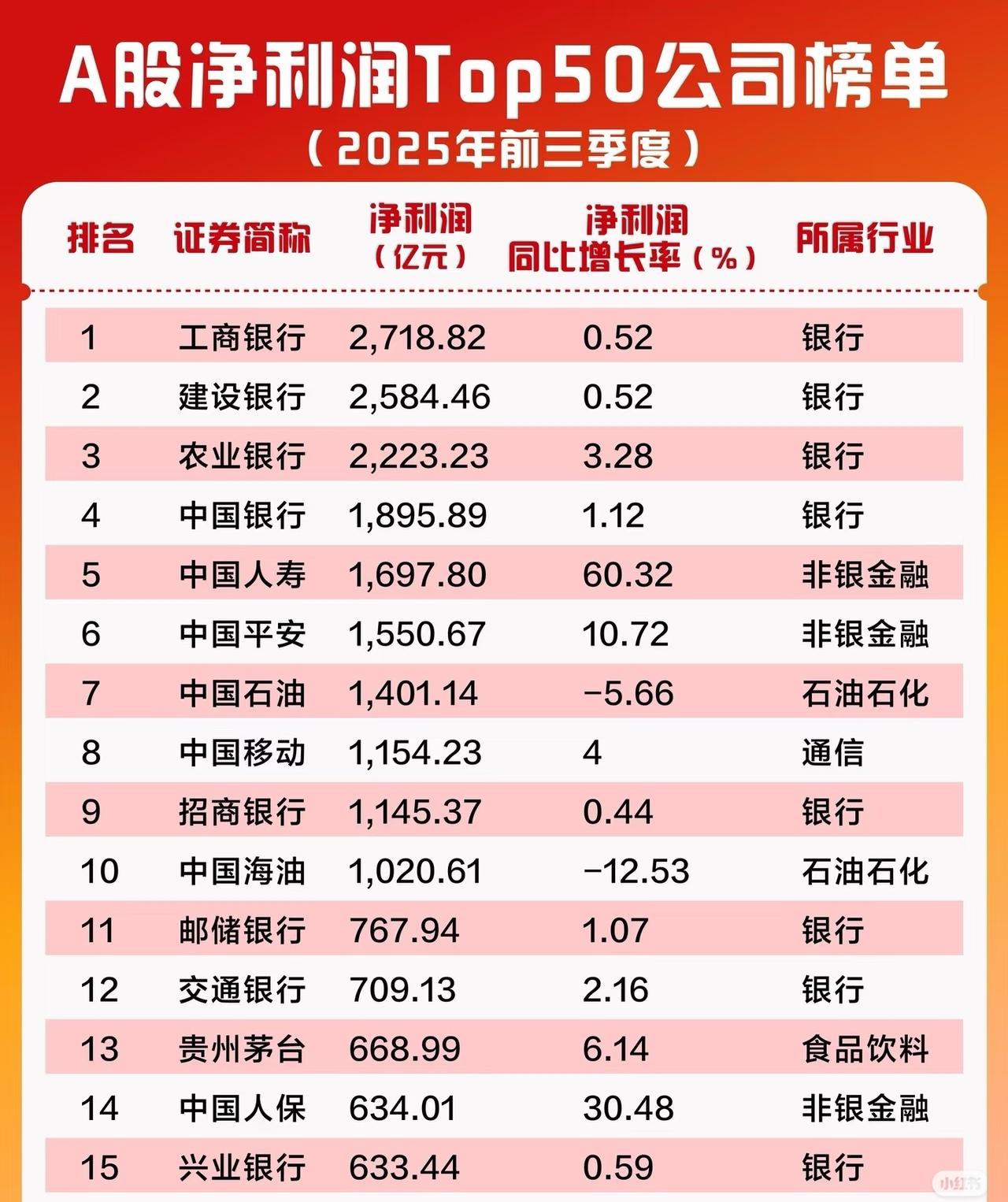 2025年前三季度A股净利润Top50公司榜单。 包含企业信息,涵盖排名、证券简称、净利润(亿元)、净利润同比增长率(%)、所属行业。 前15名多为银行(如工行、建行等),另有非银金融、石油石化等行业;16-30名涉及银行、电力设备、建筑装饰等,含宁德时代、中国建筑等;31-50名包括长江电力、比亚迪等,覆盖公用事业、汽车、电子等行业。整体数据显示各行业企业净利润规模差异大,增长率有正有负。