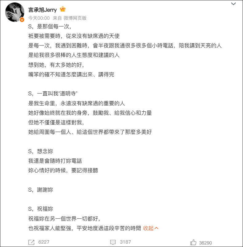 今年5月,言承旭发文称,大S一直叫他道明寺,她是生命中永远没有缺席过的重要的人。8月,言承旭到台北金宝山墓园悼念大S,久久凝视墓碑,忍不住落泪。