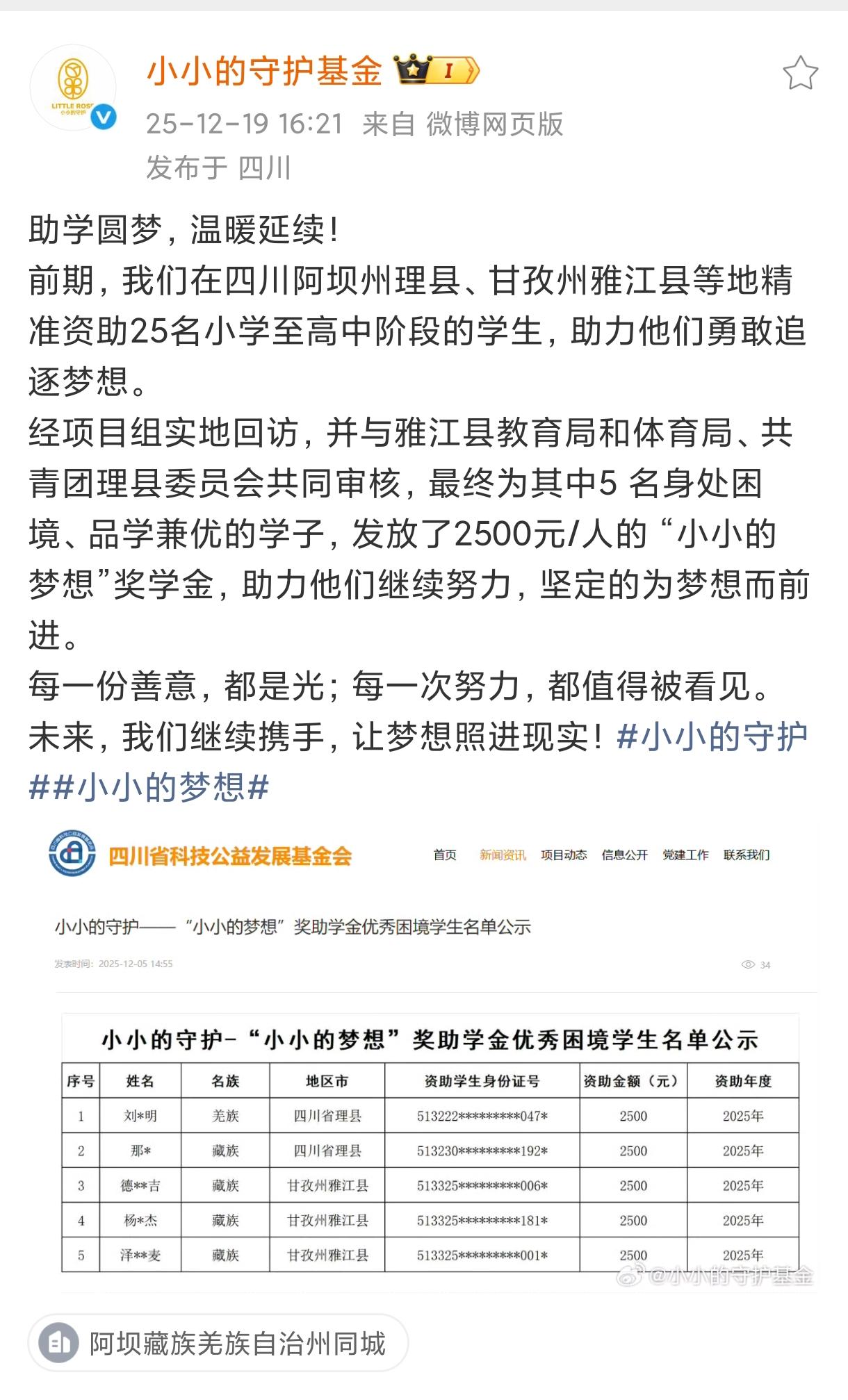 小小的你守护小小他们。精确到身份证的资助名单,出道八年公益十年。小小的...