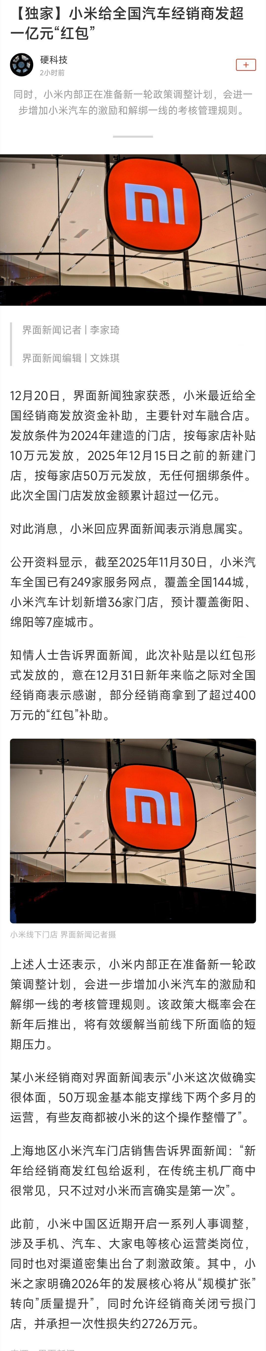 小米给汽车经销商发超一亿元红包小米汽车经销商还是蛮爽,先有雷总亲自带货不愁卖,现在又有超亿元的补贴。眼下的市场环境,各家经销商肯定都有压力,相对来说小米经销商肯定是幸福的了。小米这次的行为不能简单理解为年终福利,而是其渠道战略长期主义的具象化体现。从补贴规则来看,2024年建店补10万元、2025年新建店补50万元且无捆绑条件,差异化的补贴标准既对现有渠道伙伴的前期投入予以回馈,也能激励后续门店的拓展,是对车融合店渠道网络的持续夯实。截至2025年11月,小米汽车已布局249家服务网点、覆盖144城,此次补贴将进一步稳固渠道根基,为后续门店扩张铺路。更值得关注的是,小米同步筹备新一轮政策调整,计划增加汽车业务激励、解绑一线考核规则,结合此前小米之家从“规模扩张”转向“质量提升”的战略,不难看出小米正通过补贴、政策优化等组合拳,与渠道伙伴建立深度绑定的“共成长”模式,而非依赖短期刺激。这种对渠道伙伴的重视,本质上是小米汽车在渠道建设上坚持长期主义的核心表达,也为其汽车业务的线下布局筑牢了合作根基。