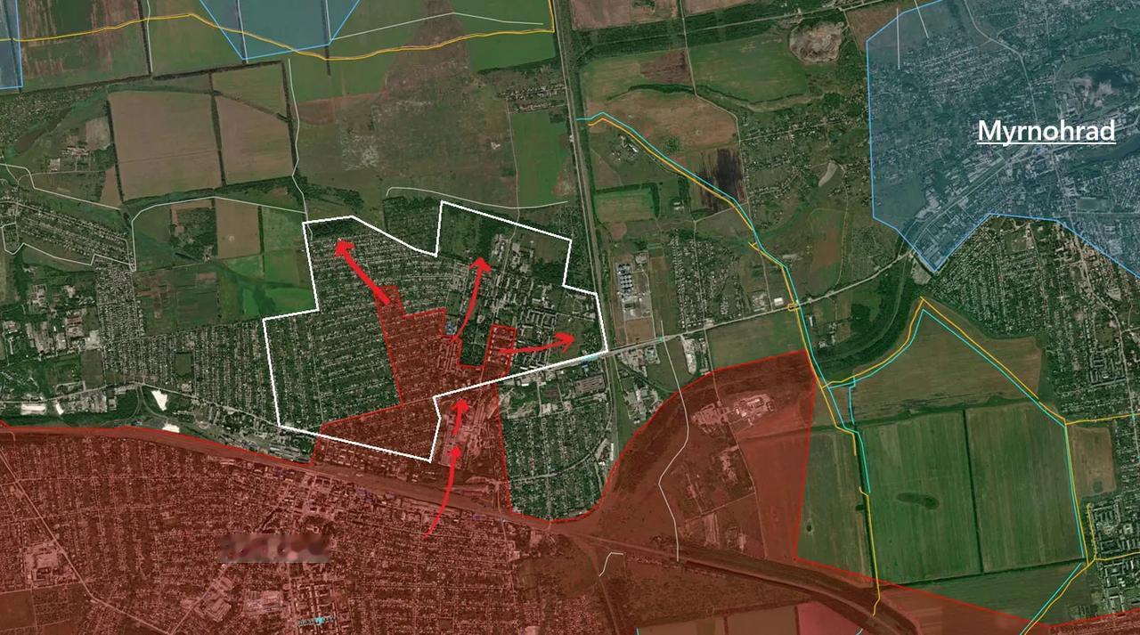 乌军主力已撤出米尔诺格勒,俄军蜂拥而至,已经在城内与乌军展开混战(见图1)。 红