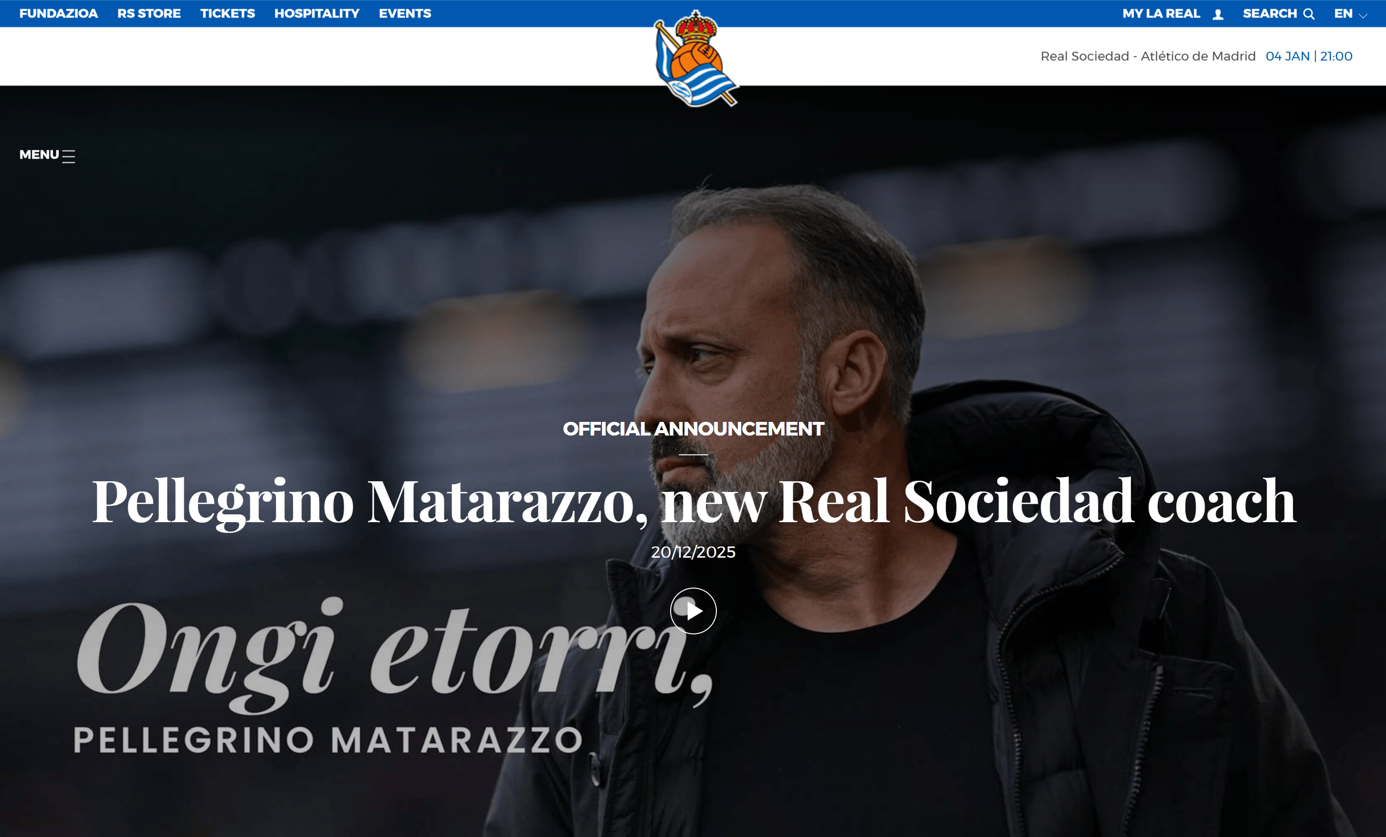 虎扑12月20日讯皇家社会在当地周六晚间发布了一则重磅消息:马塔拉佐正式出任球队新任主教练。这位出生于纽约、拥有意大利血统的教练与俱乐部签约至2027年6月。