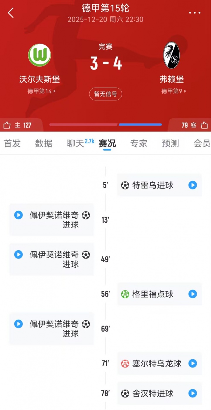 本场比赛,狼堡首发前锋佩伊契诺维奇在第13、49和69分钟连入三球,上演帽子戏法,但球队最终3-4告负,弗赖堡的4粒进球中有一粒点球,还有一粒狼堡后卫塞尔特的乌龙球。