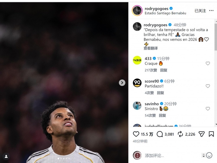 罗德里戈赛后社媒写道:“‘风雨过后,阳光总会重现,保持信念’感谢伯纳乌,2026年再见。”