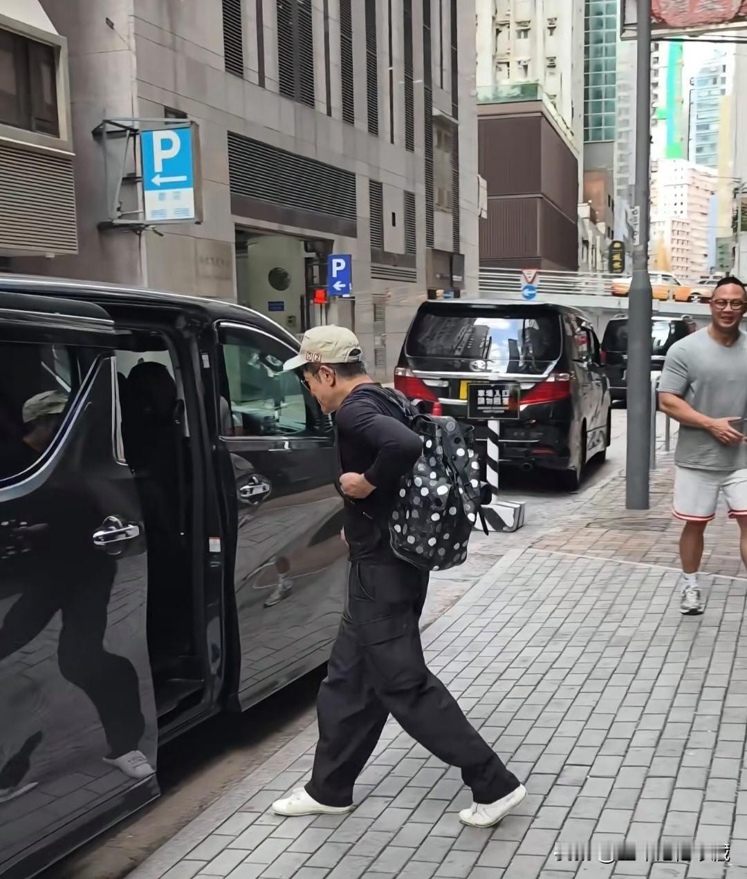 天王郭富城身穿休闲装,被花点背包现身香港街头,一猛男大哥拿手机拍摄,郭富城保养的