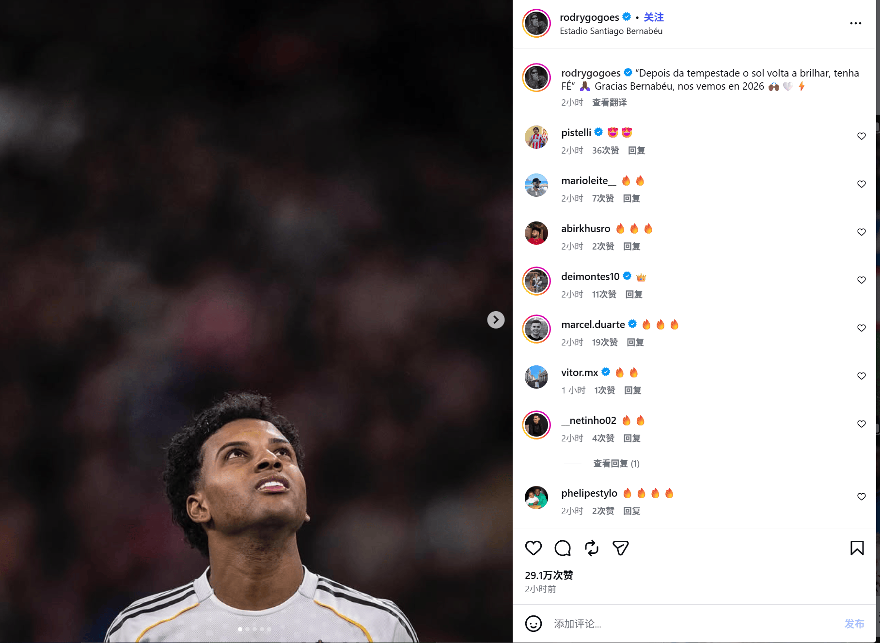 这位巴西前锋赛后也更新社媒写道:“‘风雨过后,阳光总会重现,保持信念’感谢伯纳乌,2026年再见。”