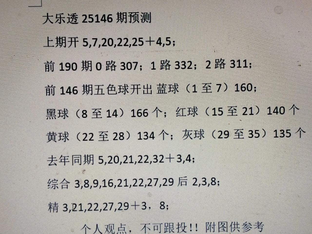 上期前区无0路号无1字头,无黑球号(8一14)。多期无3字头。本期估计仍无3字头。 上期后区开出5重号,连号4。本期估计2,3,8有号开出!