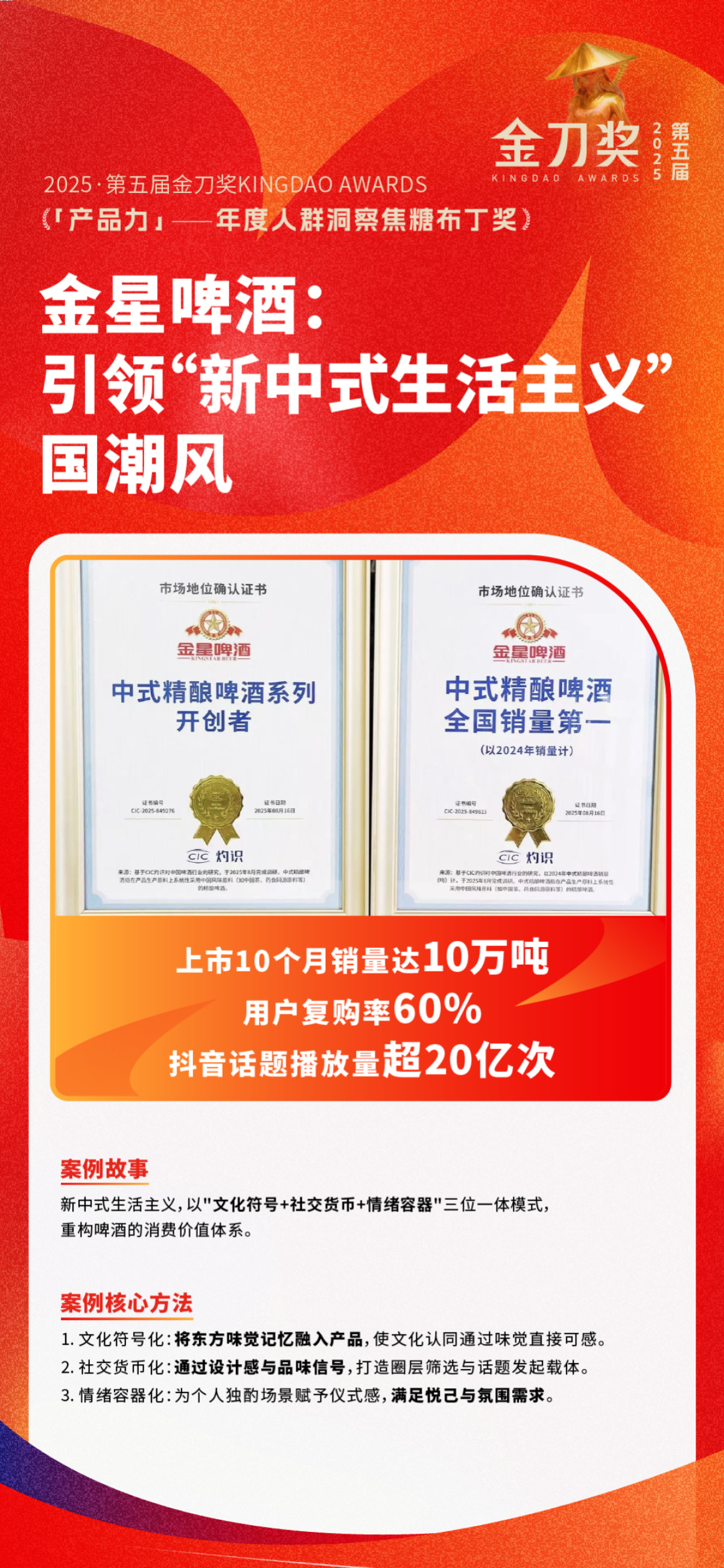 2025年12月18日,在广州举行的「激发·2025刀法年度品效峰会」暨「第五届金刀奖」品牌闭门晚宴上,金星啤酒凭借“国潮新饮——金星中式精酿与新时代文化认同者的对话”案例,从众多品牌中脱颖而出,斩获年度人群洞察焦糖布丁(JTBD)奖。