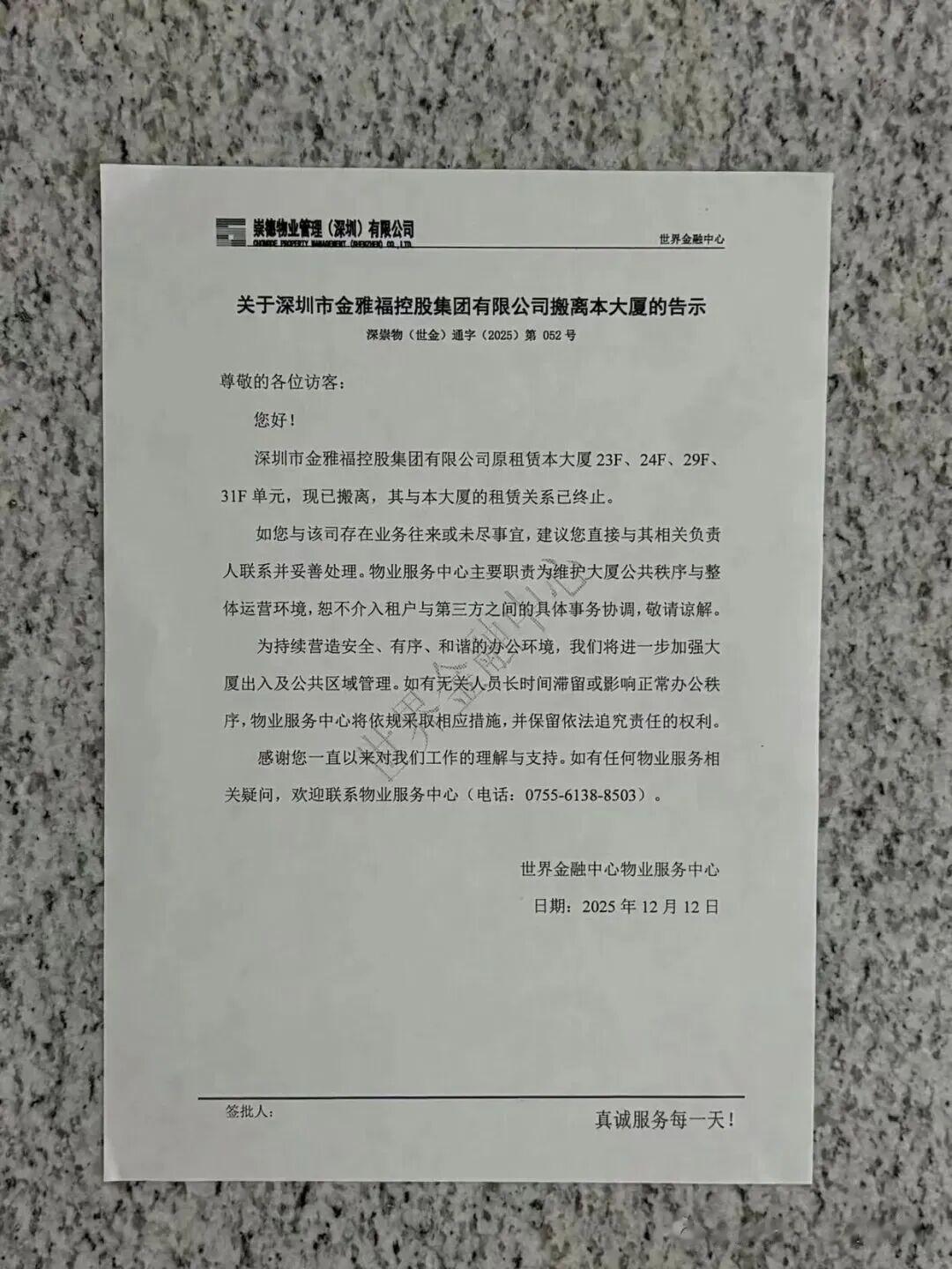 在办公室门前,落款日期为12月12日的物业中心告示称,金雅福已搬离,与大厦租赁关系终止。
