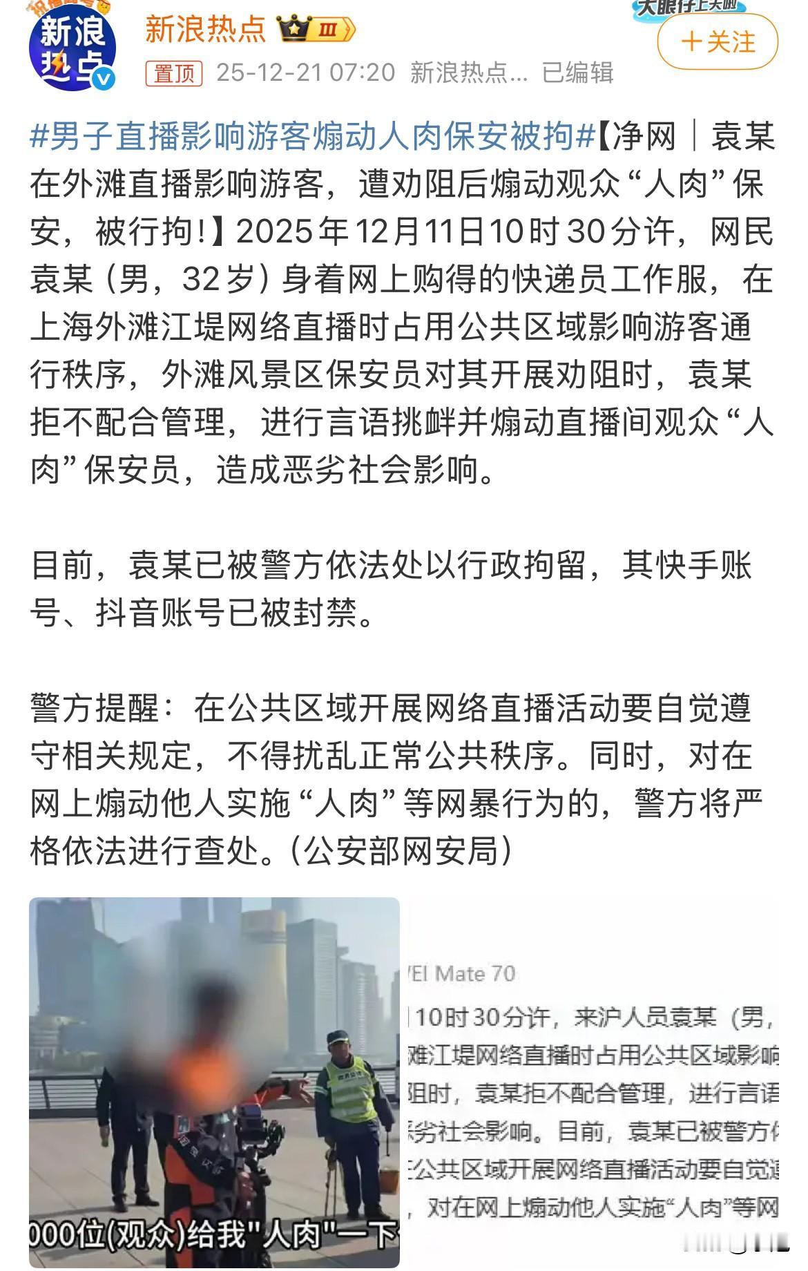 直播穿快递员衣服,镜头前扮弱势,现实里堵着外滩通道影响游客。保安来劝,他直接煽动粉丝去人肉。 网络不是自家客厅,保安更不是游戏里的NPC。举着手机就觉得能指挥一切,这种幻觉该醒醒了。 穿什么衣服不重要,重要的是在公共场所知不知道规矩。外滩是大家看风景的地方,不是谁的个人直播间。 支持拘留。账号封得好。网上喊“人肉”的时候,大概忘了法律管得着屏幕后面的人。