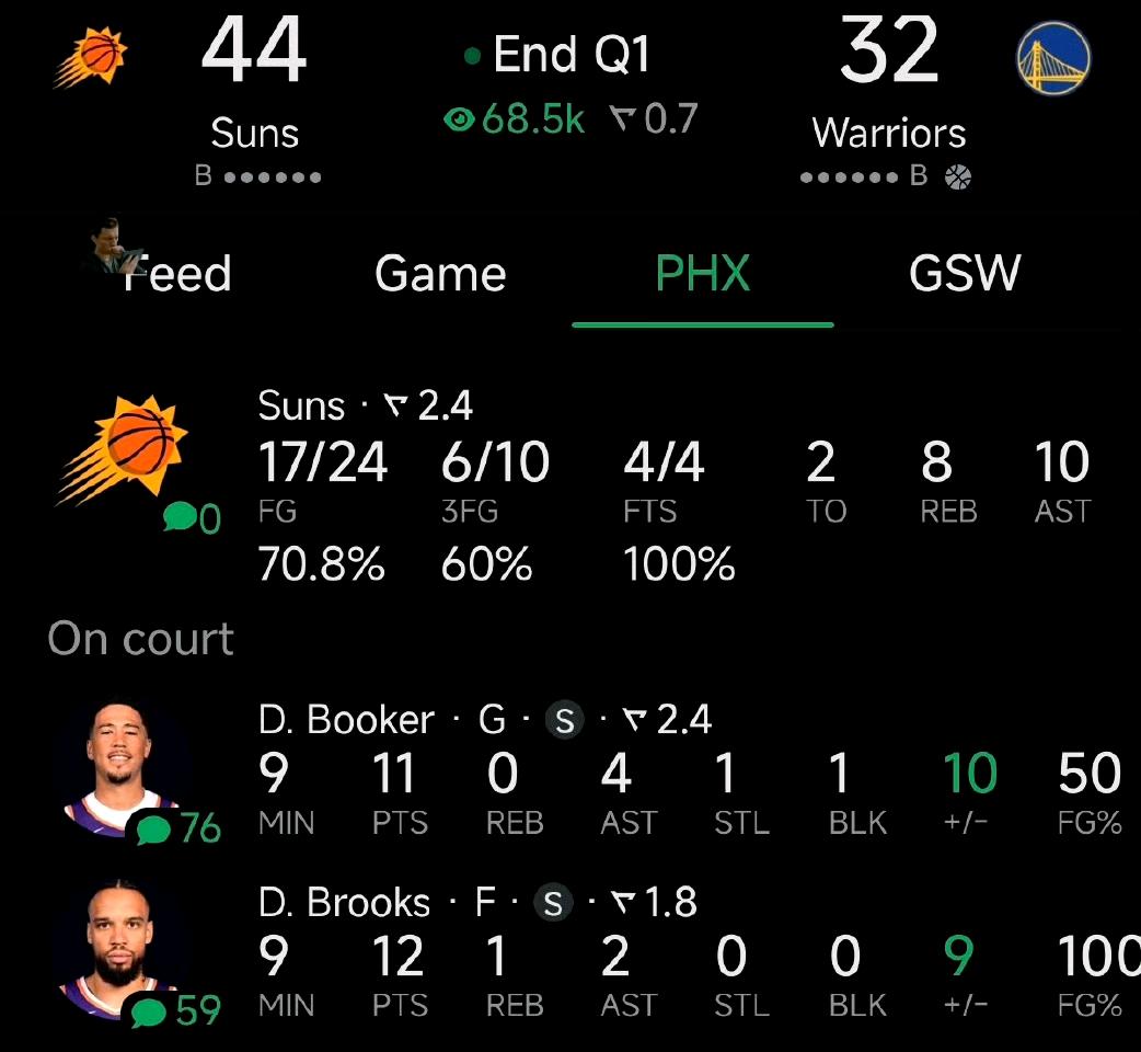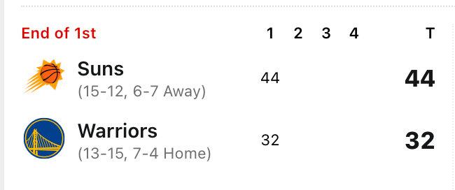 首节就丢了44分,勇士32-44太阳,这可是主场啊! 巴特勒10分,布克狄龙合砍23分,本赛季勇士已经输给太阳两次了,事不过三,难道勇士还要输? 勇士再输的话,西部第9都保持不了,看来还得指望中途交易。