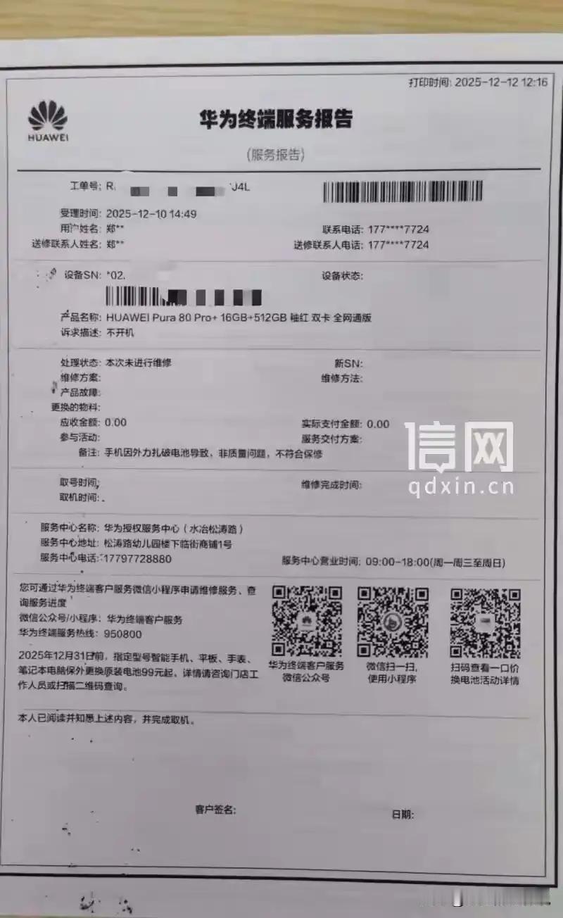 在河南安阳,有一位男子,花了6005元,买了一部华为Pura 80手机,心怀期待,仿佛握住了未来的希望。然而,人生如戏,意外总在不经意间上演。两个月后的一天,他正享受着手机带来的便利,突然间,充电时手机“爆发”了!只见黑烟滚滚,喷火星,像是火山喷发一般,令人胆战心惊。手机从桌上“跌”到地上,满地黑色粉末,宛如“黑夜中的星辰”瞬间变成“黑夜中的尘埃”。手机后盖翘起,机身变形,仿佛一只被“折磨”得千疮百孔的战士。 男子心头一紧,立即奔赴华为授权中心,期望得到公正的答复。他提出全额退款或换新机的请求,希望用“以退为进”的智慧化解这场“火海”。售后人员拍了几张照片,拿去检测,结果却让他“跌破眼镜”——“人为外力致电池受损,不属于质量问题,不在保修范围内。”这句话犹如“晴天霹雳”,让他心中充满疑问:凭照片就能判定?难道手机的“生命”就这么被“外力”所左右? 其实,健康的生活不仅仅是身体的“外在修养”,更是内心的“内外双调”。正所谓“身心同调,内外兼修”,才能“福寿绵长”。手机虽是现代人“心灵的窗户”,但它的安全与健康,更需要我们用“感恩之心”去呵护。科技虽先进,但安全意识更重要。我们要懂得“未雨绸缪”,在享受科技带来便利的同时,也要“防患未然”,让“安全”成为生活的底色。 这件事提醒我们:真正的健康,是内外兼修的平衡。就像“修身齐家治国平天下”,只有身心合一,才能“百病不侵”。生活中,我们要心怀感恩,珍惜拥有的每一份美好,用“正能量”去感染身边的人。不要让“外力”成为生活的“拦路虎”,而要用“自我修养”去“化险为夷”。 人生如行路,路在脚下。愿我们都能“心怀感恩,内外兼修”,在这大千世界中,行稳致远,迎来属于自己的“光明未来”。让我们用“智慧与善良”点亮生活的每一个角落,共同书写一篇“天地宽,人间美”的华章! 华为80pro