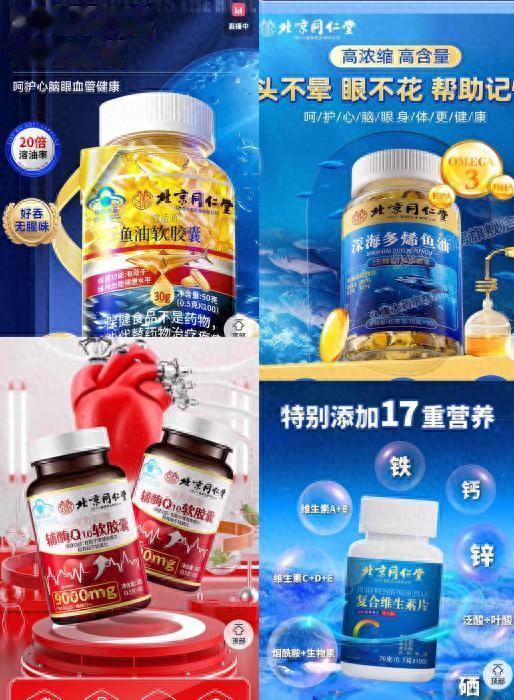 目前在电商平台上,仍存在大量刻意突出“北京同仁堂”字样,但未使用同仁堂认定双龙商标的产品,包括深海鱼油、复合维生素片、辅酶胶囊等。